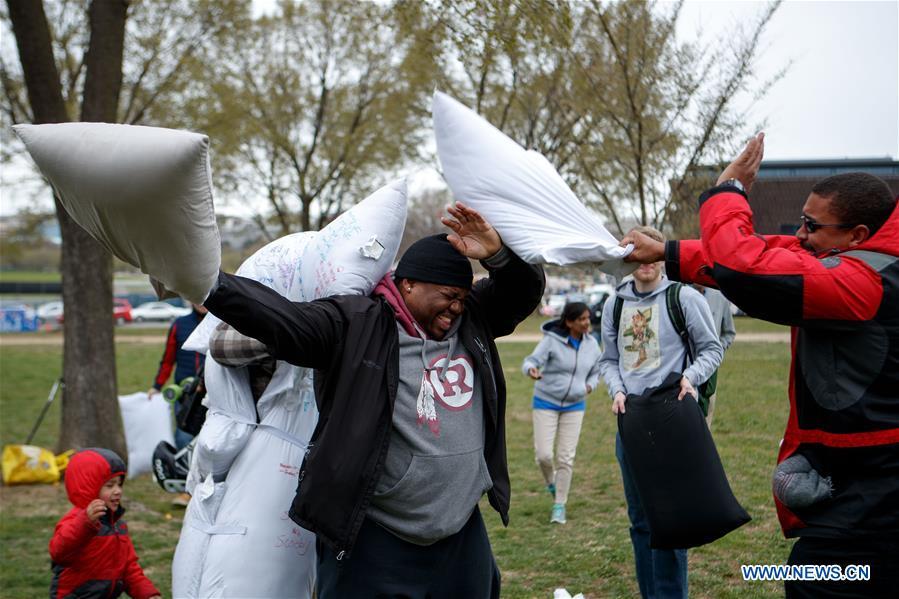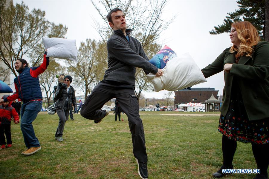 People participate in a pillow fight in Washington D.C., the United States, on April 7, 2018. (Xinhua/Ting Shen)
