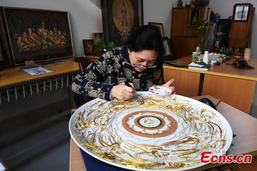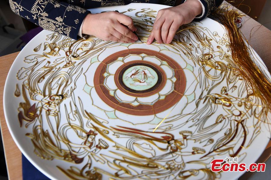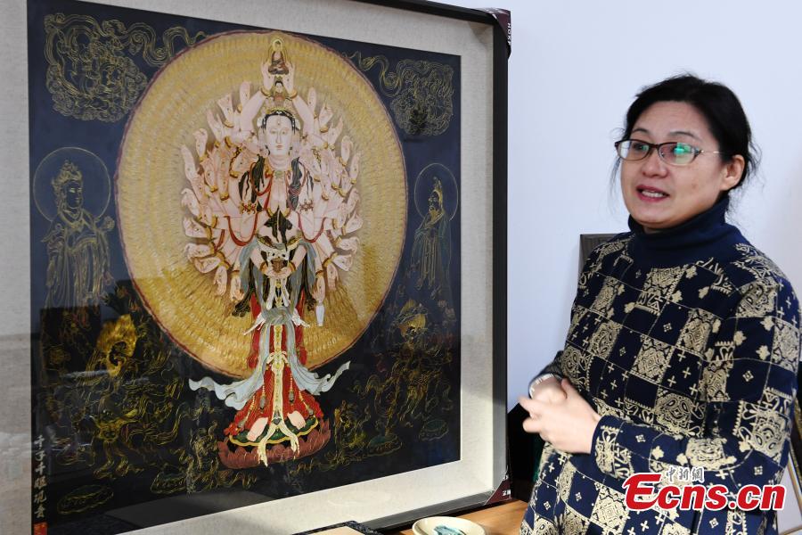 Bai Xi, a teacher with the Lanzhou University of Arts and Science, shows her cloisonne enamel creation of Bodhisattvas Guanyin in Lanzhou City, Northwest China's Gansu Province, April 7, 2018. Bai, a fan of painting, has spent over ten years in studying the ancient technique for decorating metalwork objects. She said she used about 10,000 metal wires, of one meter long each, to create her most satisfied Bodhisattvas pattern, inspired by the murals in Mogao Caves. (Photo: China News Service/Yang Yanmin)