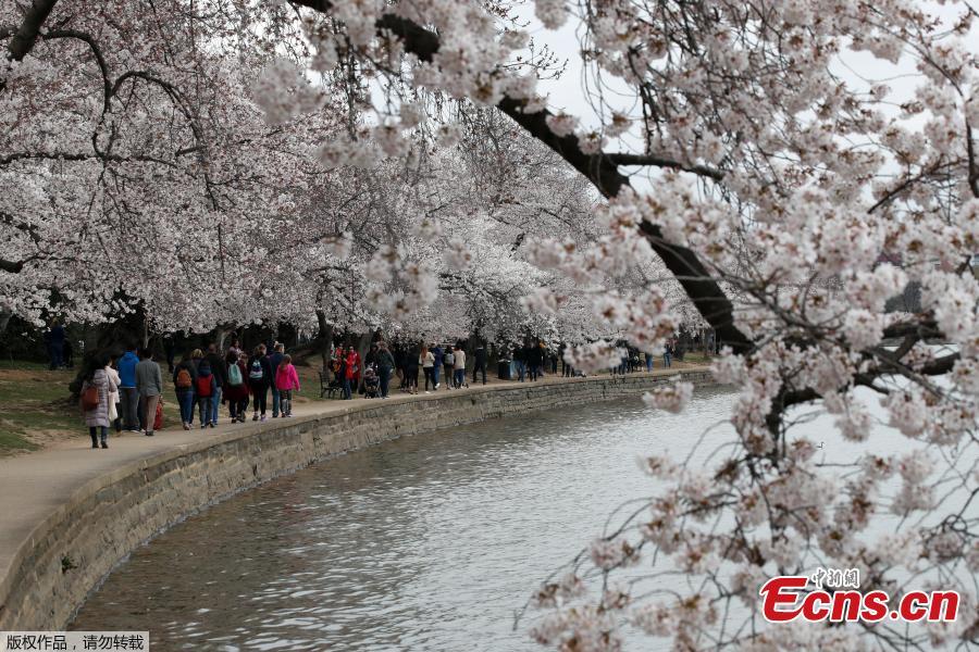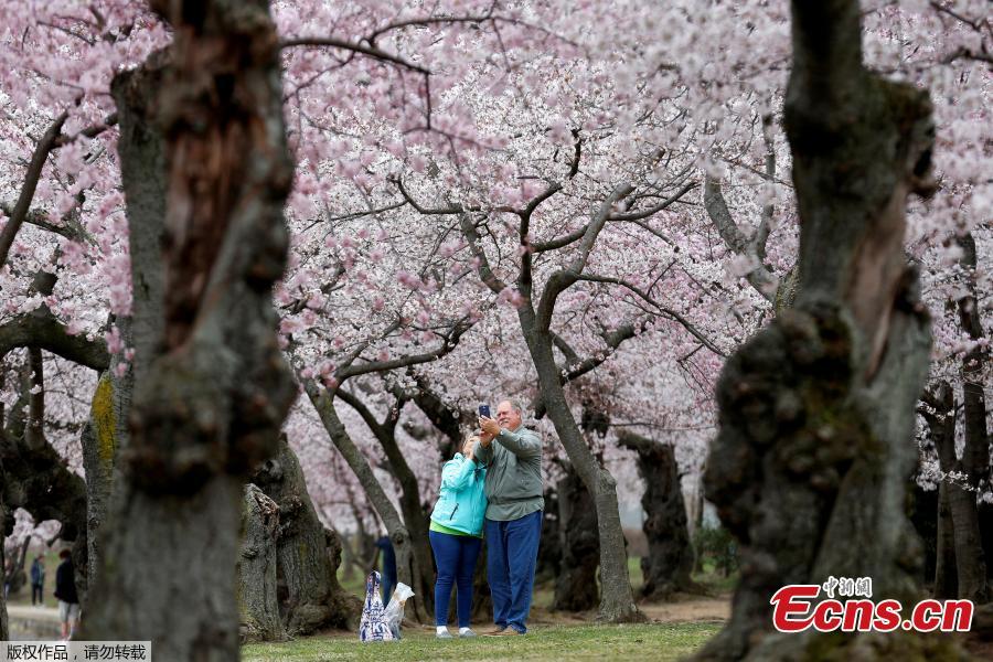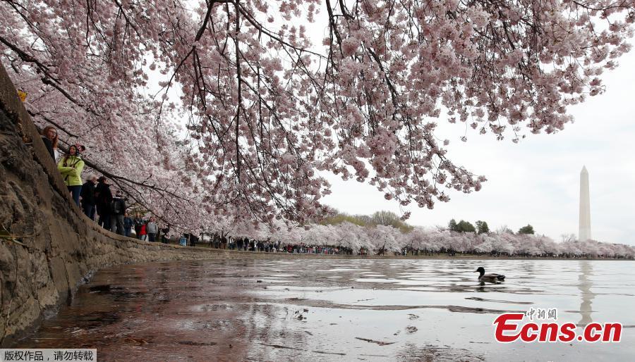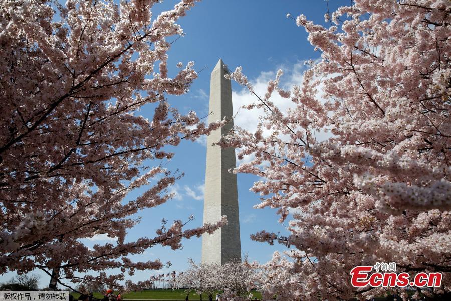 The Washington Monument stands behind blooming cherry trees in Washington, U.S., April 5, 2018. (Photo/Agencies)