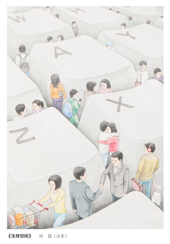 A comic work titled The Living Space on display at the China Cultural Center in Tokyo on April 3, 2017. The piece has a touch of black humor, depicting people living within the cracks of computer keyboards. (Photo/Chinaculture.org)