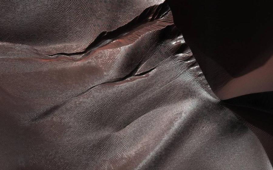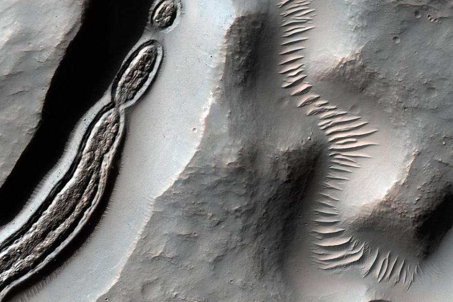 This image from NASA's Mars Reconnaissance Orbiter is a close-up of a trough, along with channels draining into the depression. Some HiRISE images show strange-looking formations. Sometimes it helps to look at Context Camera images to understand the circumstances of a scene -- like this cutout from CTX 033783_1509 -- which here shows an impact crater with a central peak, and a collapse depression with concentric troughs just north of that peak. On the floor of the trough is some grooved material that we typically see in middle latitude regions where there has been glacial flow. These depressions with concentric troughs exist elsewhere on Mars, and their origins remain a matter of debate. NASA's Mars Reconnaissance Orbiter, launched August 12, 2005, is on a search for evidence that water persisted on the surface of Mars for a long period of time. (Photo/NASA)