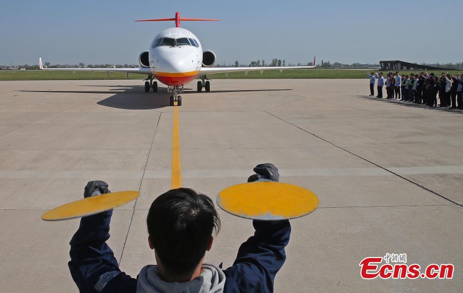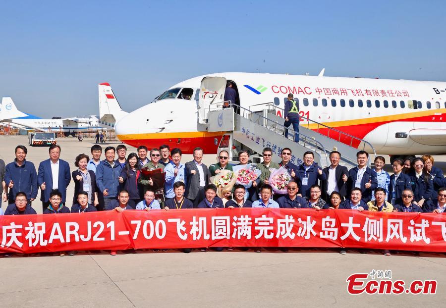 China's first homegrown regional jetliner, the ARJ21-700, has completed a crosswind flight test. An ARJ21-700 aircraft landed at around 3 p.m. Sunday, April 8, 2018 at Yanliang airport in Xi'an, Shaanxi Province, after a 41-day trip to Iceland, according to the Shanghai-based Commercial Aircraft Corp. of China (COMAC), its producer. Test pilots performed six pairs of takeoffs and landings with crosswind speeds of over 30 knots (55 kph) at the Keflavik Airport in Iceland, where two intersecting runways generate a suitable crosswind test environment. (Photo provided to China News Service)