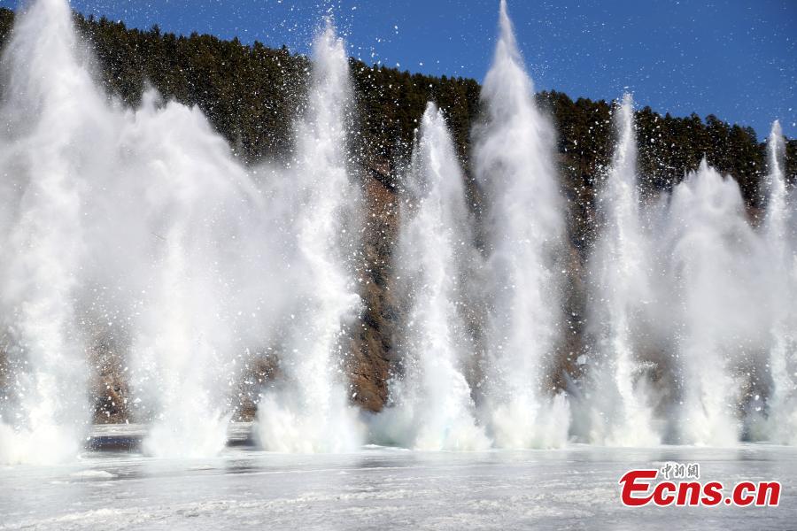 Ice is exploded in the Heilong River in Mohe County, Northeast China's Heilongjiang Province. To prevent chunks of ice from jamming as temperatures rise, local authorities broke up the icy river in a series of controlled explosions from April 4 to 8. (Photo: China News Service/Wang Jingyang)