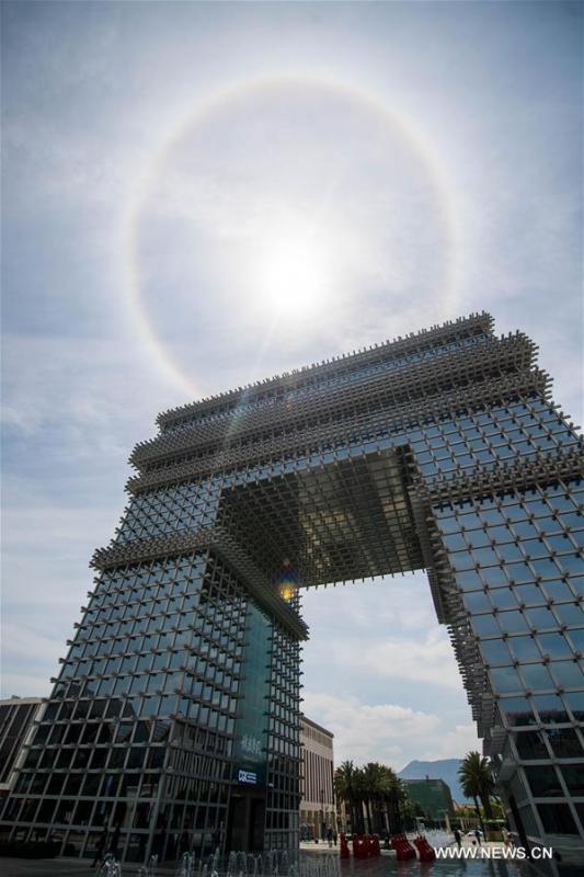 Photo taken on April 9, 2018 shows a view of solar halo over Kunming City, capital of southwest China's Yunnan Province. (Xinhua/Hu Chao)