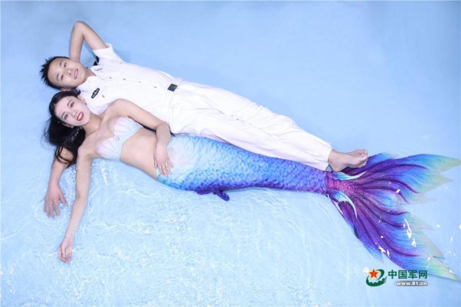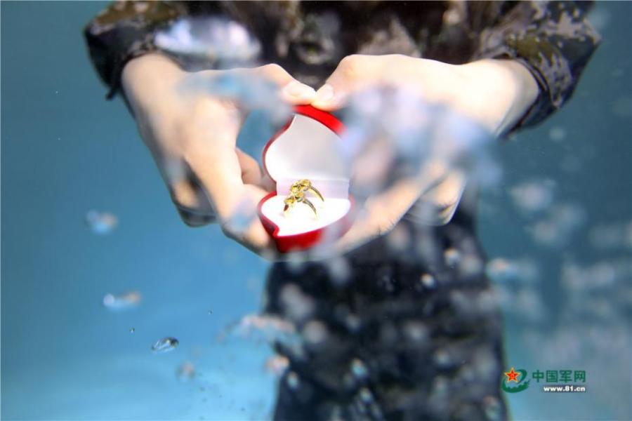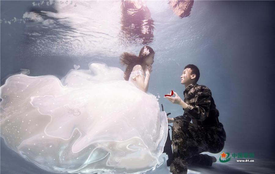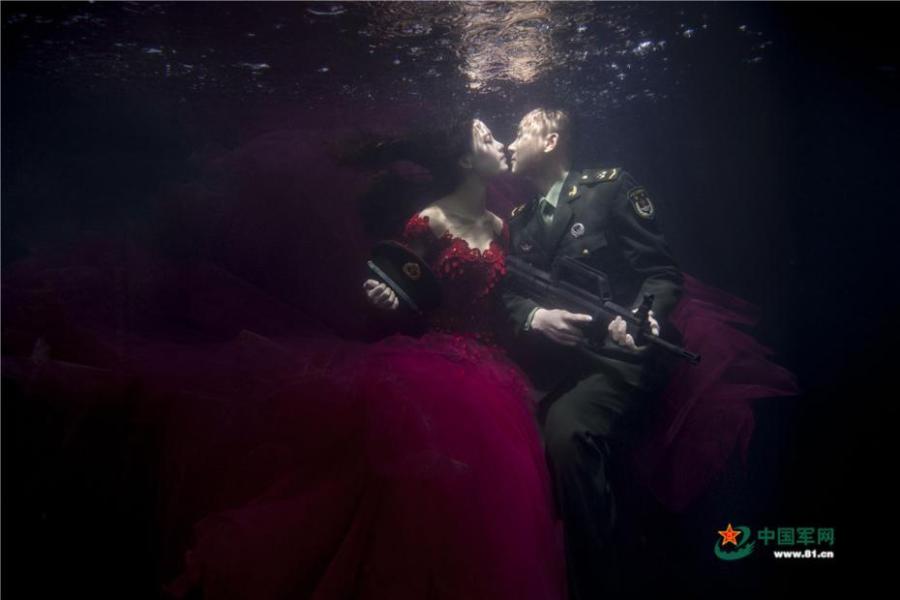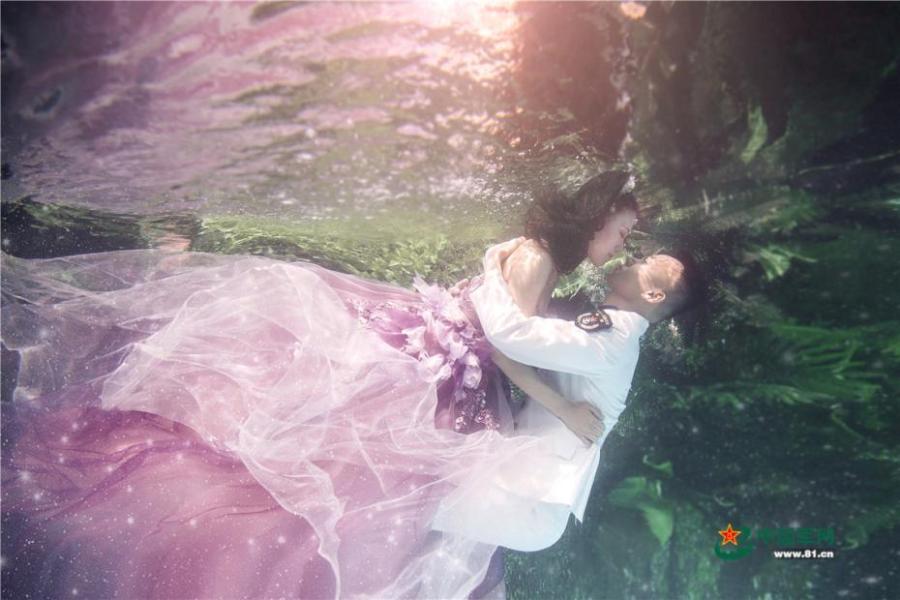 Two veterans pledged to shoot an underwater wedding photography session free of charge for a lucky couple, as long as one of the pair is engaged in military service. Days later, they took these photos for Liu Chao, who serves in the PLA Army, and his fiancée Liu Xiaolu. The pair are set to be married in a few months' time. Liu had only one day off duty, so the veterans-turned photographers had to work through the night to ensure the photo shoot ran smoothly. The lovers have been in a relationship for six years, but for much of that time they have been separated due to Liu's military service. (Photo/81.cn)