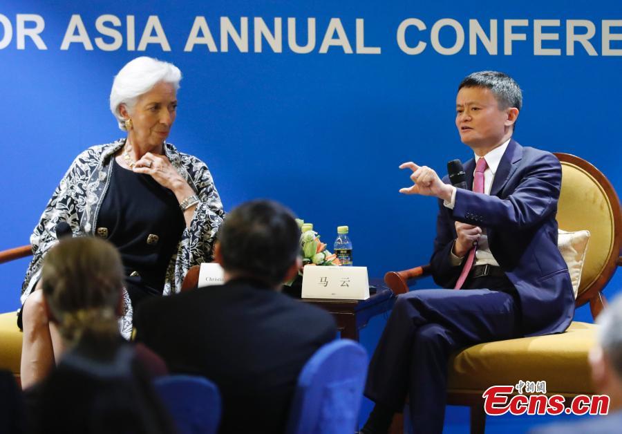 IMF Managing Director Christine Lagarde, and Jack Ma, founder and chairman of Alibaba Group, talk on the sidelines of the Boao Forum for Asia Annual Conference in Boao Town, South China's Hainan Province, April 9, 2018. Countries should resist the temptation for inward policies and protectionist sentiments to sustain sound economic growth, Lagarde said on Monday. (Photo/China News Service: Du Yang)