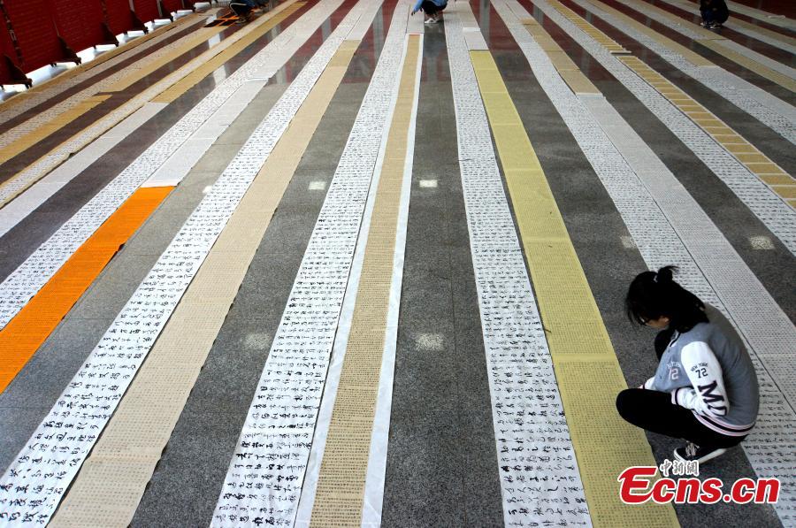 The hand-writing homework of students from the Yu Youren Calligraphy School is on display in a hall at Xianyang Normal University in Xianyang City, Northwest China's Shaanxi Province, April 9, 2018. Students were required to finish calligraphy writing of 20,000 Chinese characters during their one-month winter vacation. The school said it aims to foster a habit for students to write calligraphy. (Photo: China News Service/Zhang Yuan)