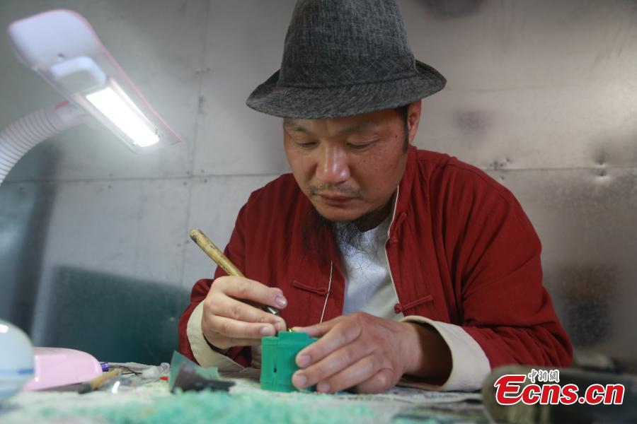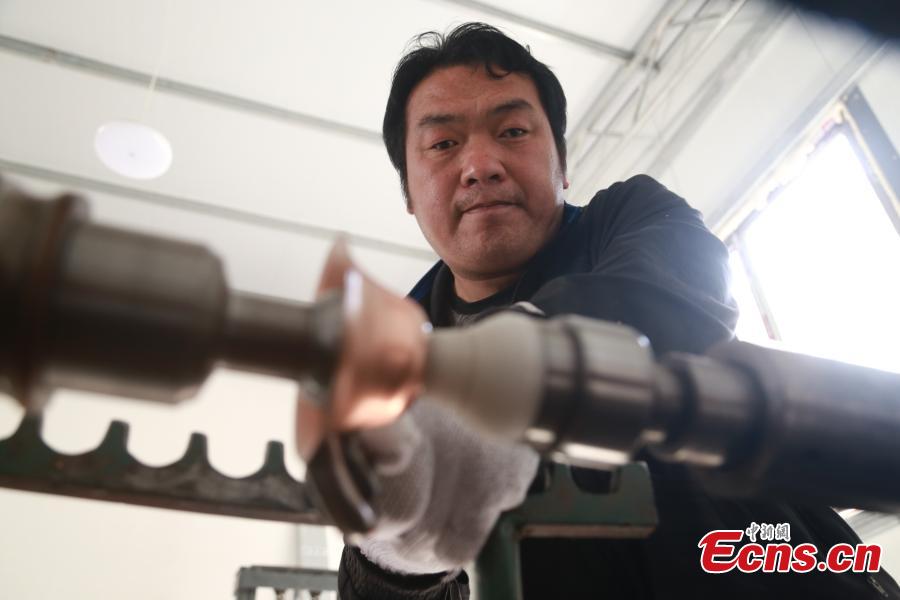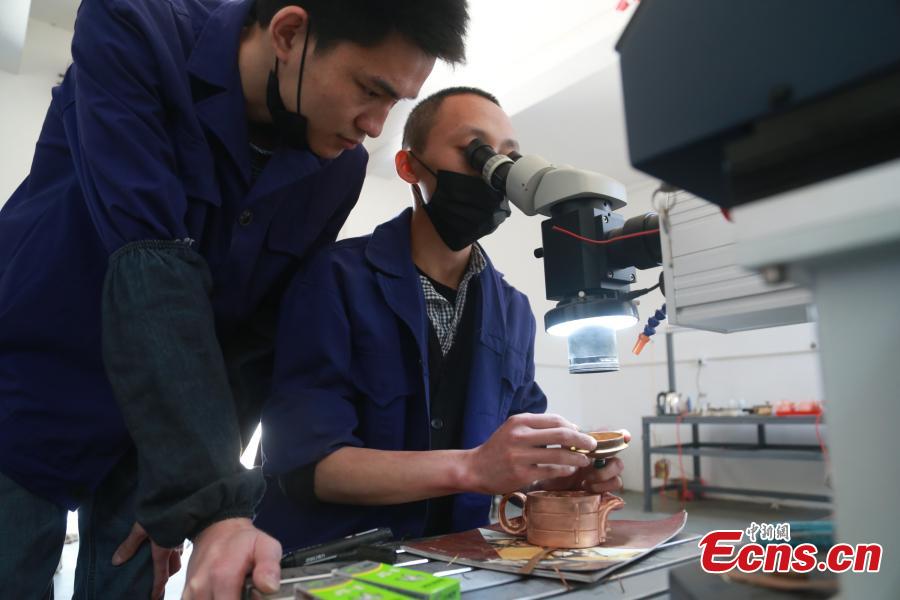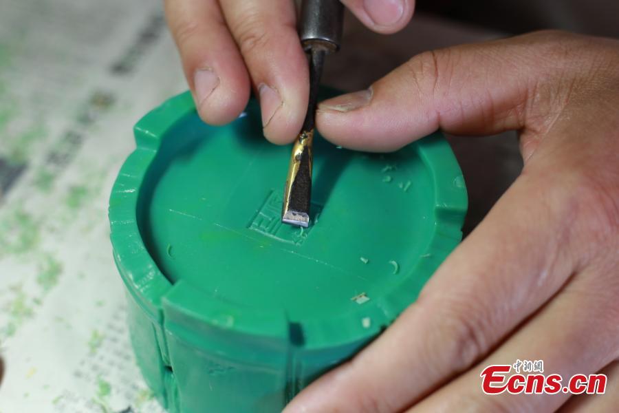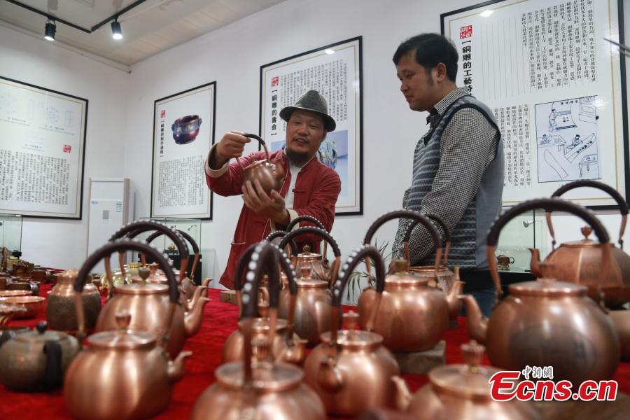 Coppersmith Chen Wenwu makes a copper work in Dexing City, East China's Jiangxi Province. Chen said 24 steps are required to make an elaborate copper pot, which range in price from 100 yuan ($15) to tens of thousands of yuan. Dexing City is known for its rich resources of gold, silver and copper, earning the city the name of the "copper capital of China". The city has given priority to developing the refined processing of non-ferrous metal and supporting the work of craftspeople. (Photo: China News Service/Dong Shichao)