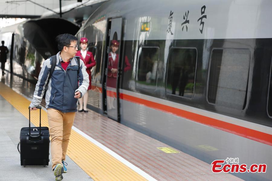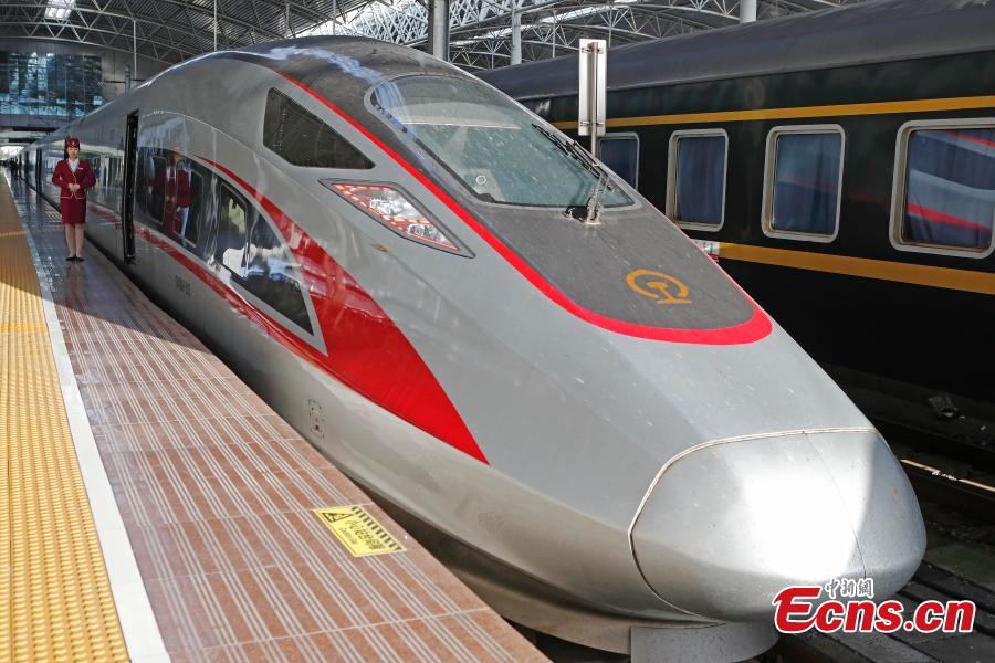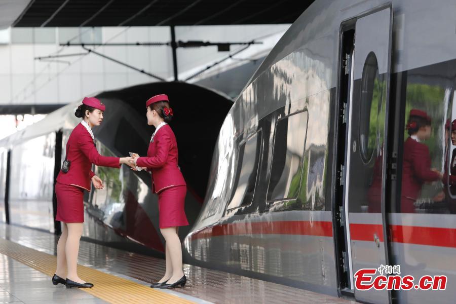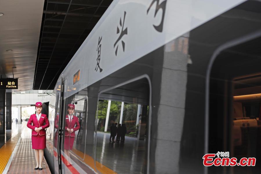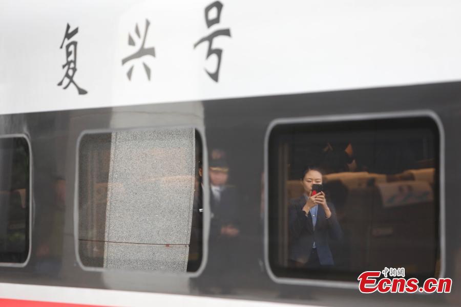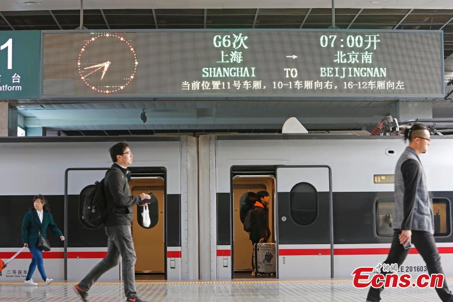 A Fuxing bullet train prepares to leave the railway station in Shanghai, April 10, 2018, on its way to Beijing. The maximum speed of bullet trains on the Beijing-Shanghai High-Speed Railway is 350 kilometers per hour, the world's fastest train service. China launched a new train schedule starting on Tuesday. The number of Fuxing trains from Shanghai to Beijing increasing from seven to 10, with the fastest taking only 4 hours and 18 minutes. The Fuxing trains are a substantial upgrade on the previous bullet trains, known as Hexie, or Harmony. Entirely designed and manufactured in China, the Fuxing is more spacious and energy-efficient, with a longer service life and better reliability. (Photo: China News Service/Yin Liqin)