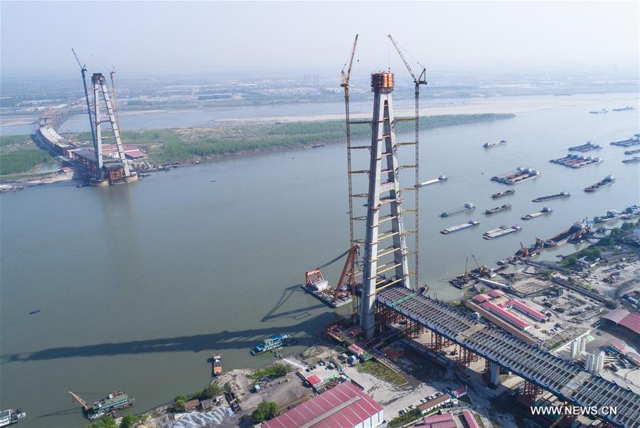 Aerial photo taken on April 10, 2018 shows the south main bridge tower of the Qingshan Yangtze River Bridge, the 11th over the Yangtze in Wuhan, central China's Hubei Province. The main structure of the 271.5-meter-high bridge tower, the world's tallest A-shaped bridge tower, was finished on Tuesday. (Xinhua/Xiao Yijiu)