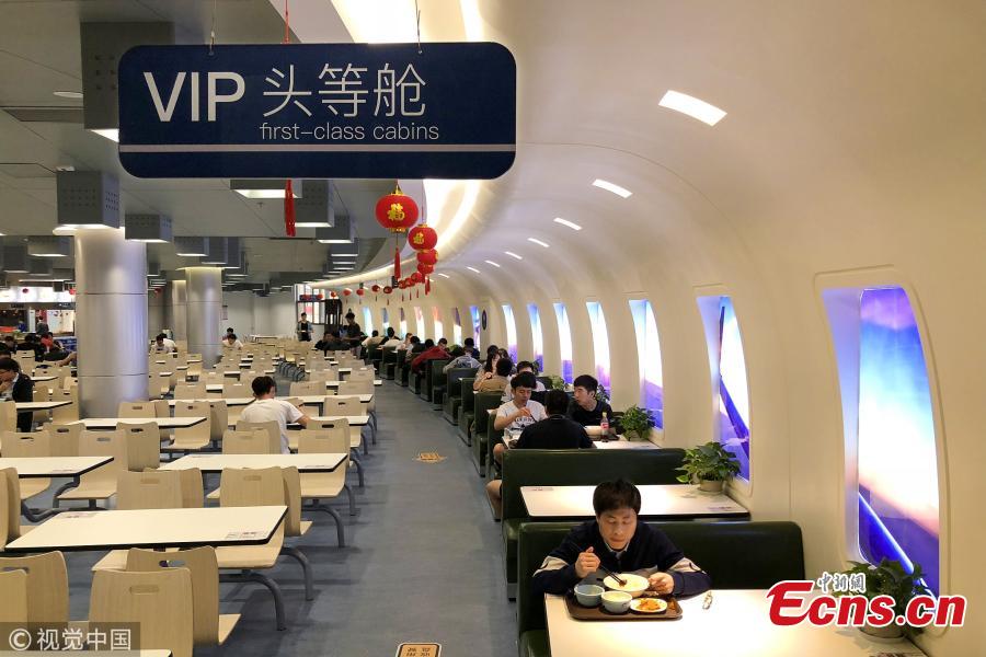 A view of the plane-themed canteen at the Nanjing University of Aeronautics and Astronautics in Nanjing City, the capital of East China's Jiangsu Province, April 11, 2018. The university has renovated a canteen to look like plane cabin and even includes check-in and a first-class zone. (Photo/VCG)