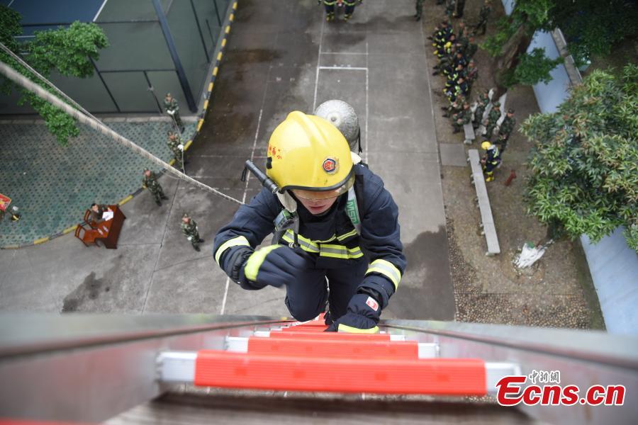 Firefighters demonstrate their skills in a contest in Liuzhou City, South China's Guangxi Zhuang Autonomous Region, April 16, 2018. Some firefighters were able to climb stairs on a building with four floors in just 25 seconds. (Photo: China News Service/Wang Yizhao)