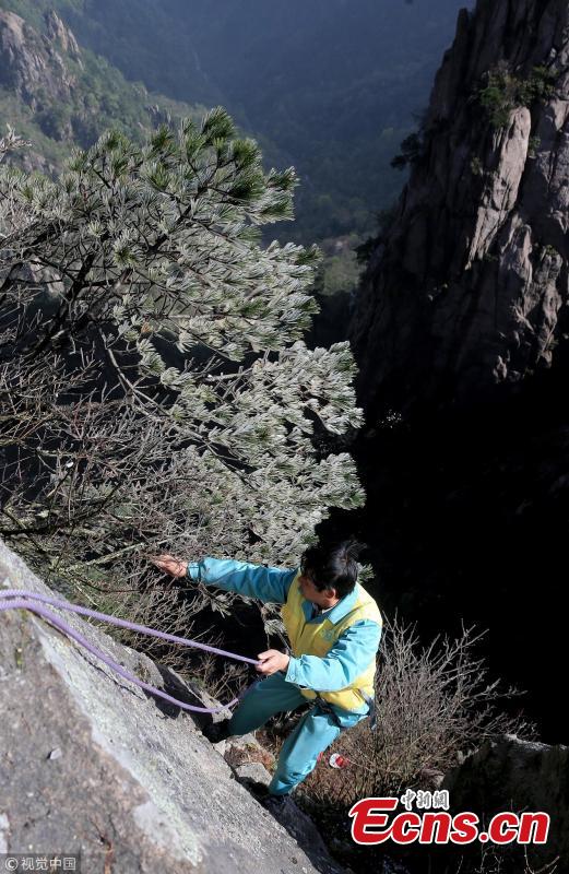Jiang Decheng, a sanitary worker at the Yellow Mountain scenic area, climbs down a cliff to pick up a cellphone for a tourist in Anhui Province, April 15, 2018. Jiang is among a team trained to climb the cliffs while hanging on ropes to clean up trash or find lost items for tourists. (Photo/VCG)