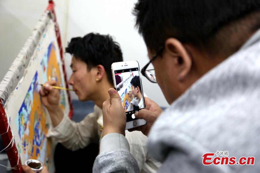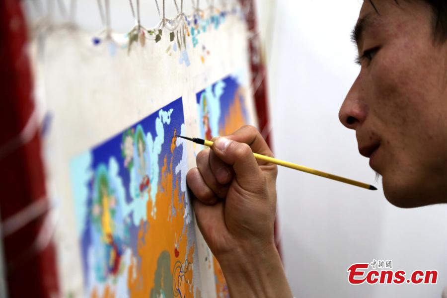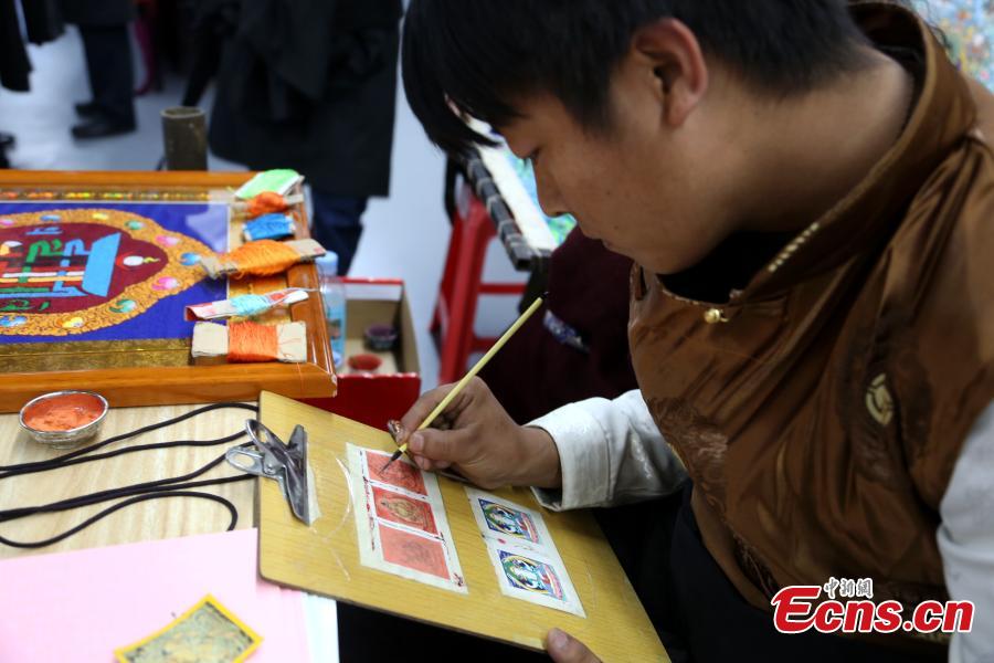 A painter demonstrates the making of a thangka painting during an exhibition at the Qinghai Art Museum in Xining City, Northwest China's Qinghai Province, April 18, 2018. The exhibition invited painters from Huangnan Tibetan Autonomous Prefecture in Qinghai to show traditional techniques and skills in making thangka, which is a special art of Tibetan Buddhism that has a number of different varieties. The scroll paintings in Huangnan are known for their colors and the elaborate skill required for their creation. (Photo: China News Service/Sun Rui)