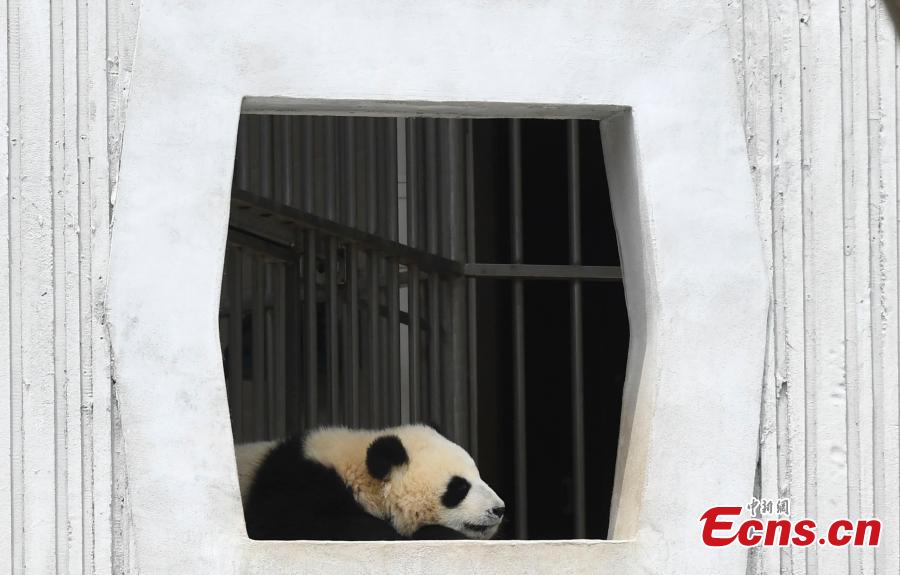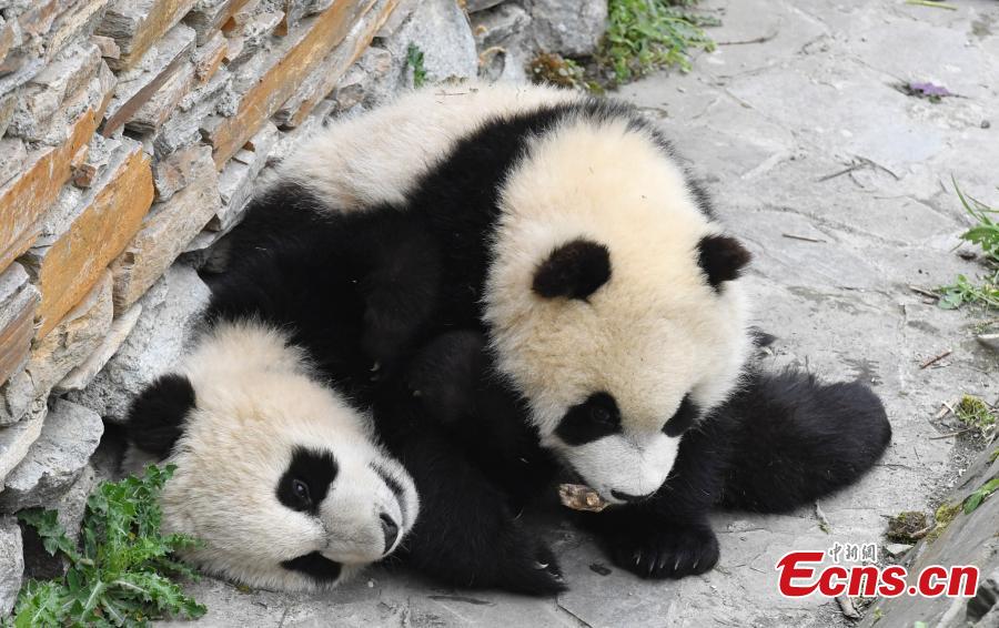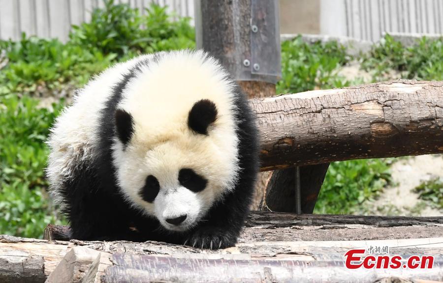 A giant panda born this year at the China Conservation and Research Center for the Giant Panda plays in a base on a sunny day. (Photo: China News Service/An Yuan)