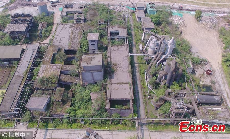 Photo taken from the air shows the ruins of a fertilizer plant in Shifang City, Southwest China's Sichuan Province, April 18, 2018. The plant was destroyed in the Wenchuan Earthquake in 2008 and has been transformed into a site to mark the disaster as well as being also used as an educational base. (Photo/VCG)