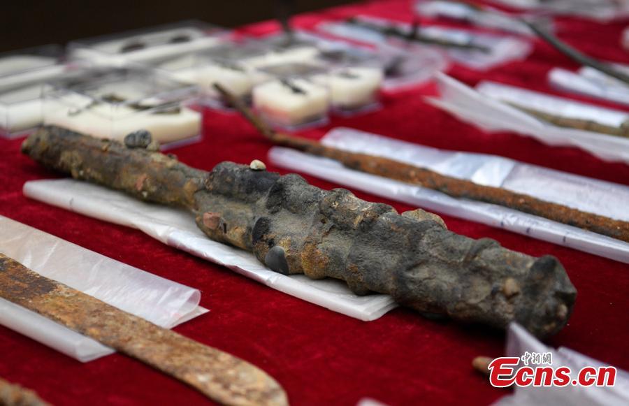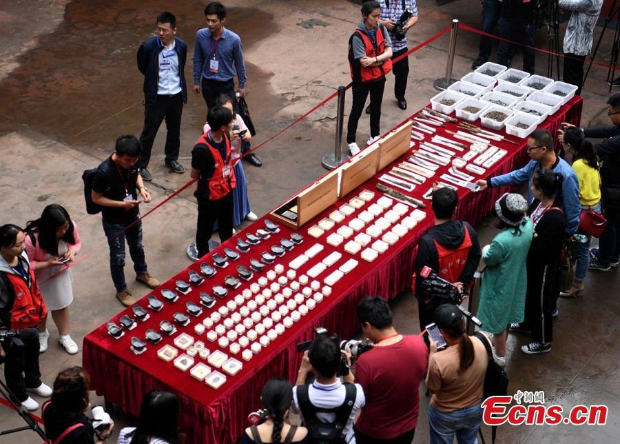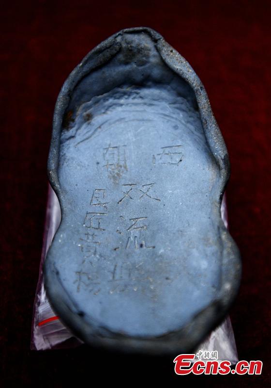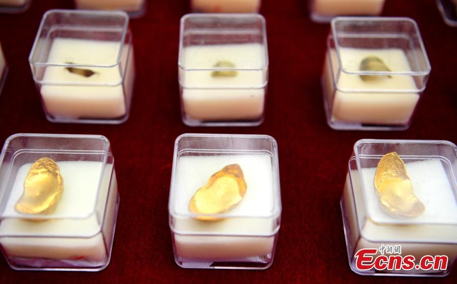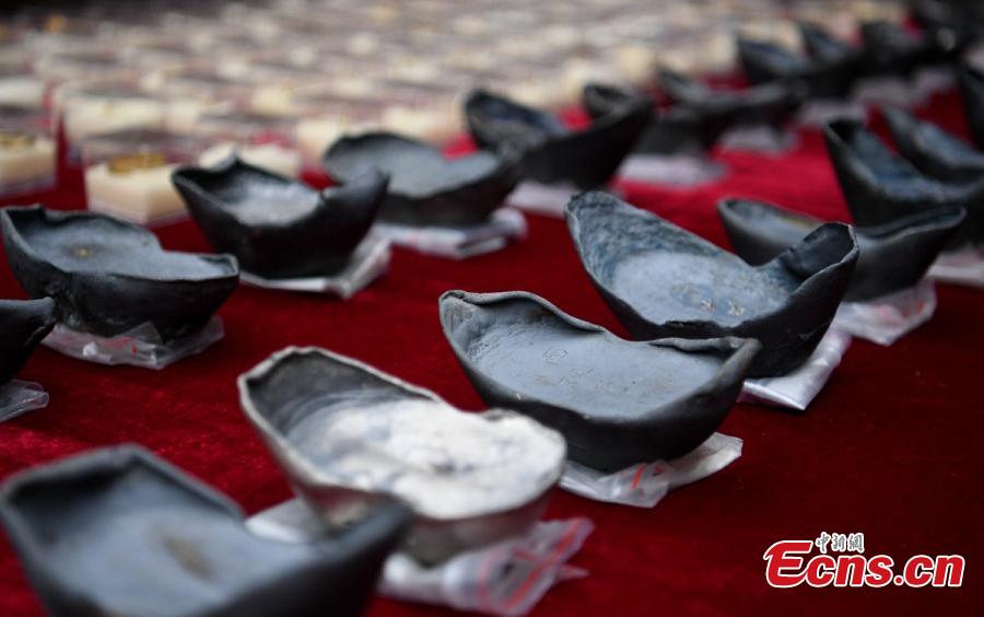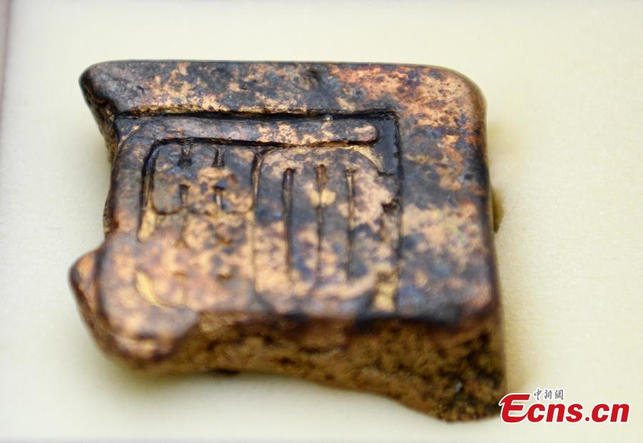 Photo taken on April 20, 2018 shows a gold ingot unearthed during an archaeological excavation at Pengshan District in Meishan City, Southwest China's Sichuan Province. More than 12,000 items that sank to the bottom of a river in Sichuan Province over 300 years ago have been recovered, archeologists said Friday. The items included a large amount of gold, silver and bronze coins and jewelry as well as iron weapons such as swords, knifes and spears. Legend had it that in 1646, peasant leader Zhang Xianzhong was defeated by Ming Dynasty (1368-1644) soldiers while attempting to transfer his large haul of treasure southward. About 1,000 boats loaded with money and assorted valuable were said to have sunk in the skirmish. (Photo: China News Service/Liu Zhongjun)
