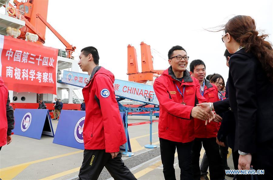 Aerial photo taken on April 21, 2018 shows members of China's 34th Antarctic expedition taking part in a welcoming ceremony on a dock in Shanghai, east China. China's research icebreaker Xuelong finished the country's 34th Antarctic expedition and returned to Shanghai on Saturday. The expedition began on Nov. 8, 2017 and covered a voyage of 38,000 nautical miles. (Xinhua/Fang Zhe)