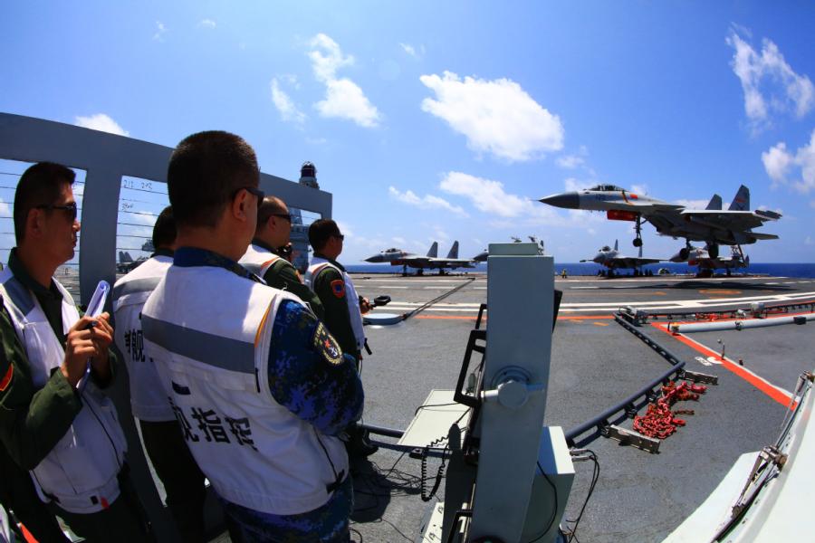 The aircraft carrier CNS Liaoning leads its battle group on its first combat exercise in the western Pacific on Friday. (Hu Kaibing/For China Daily)