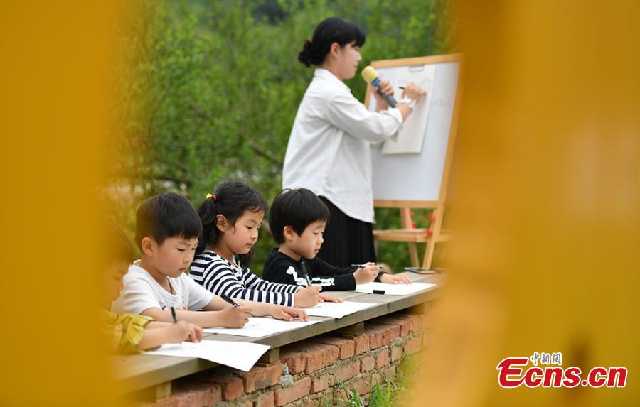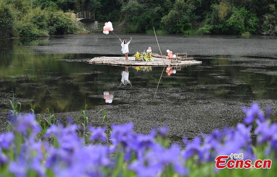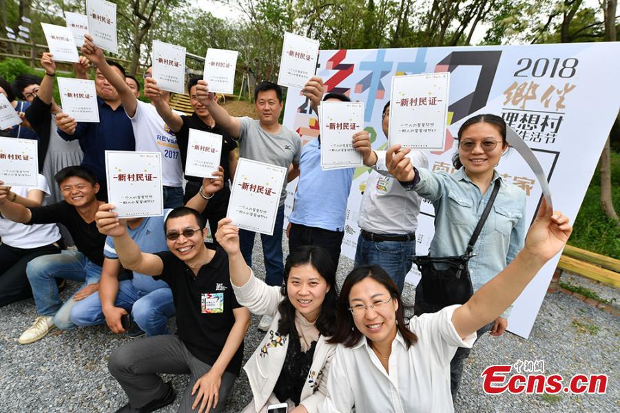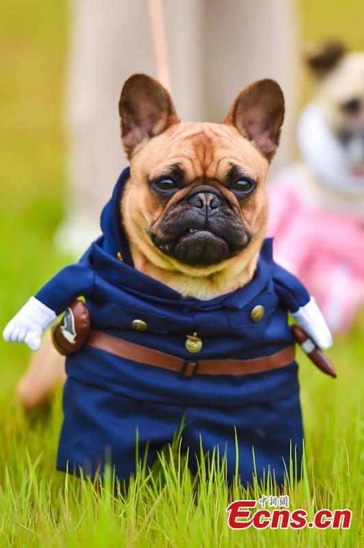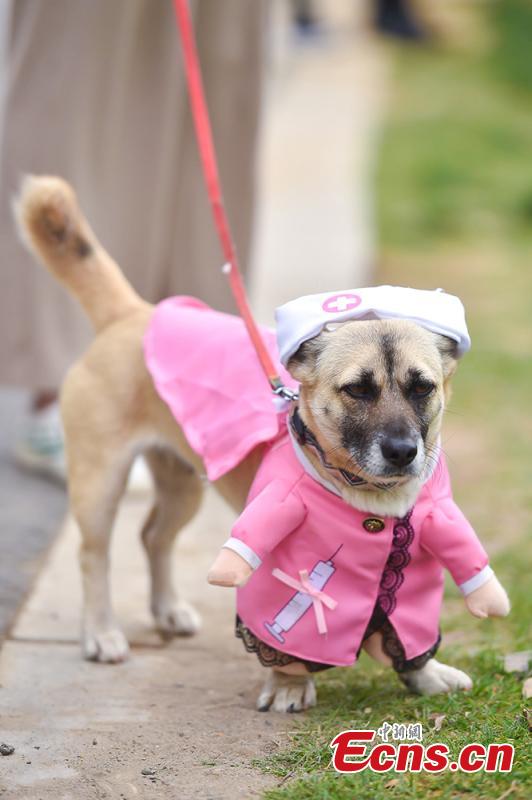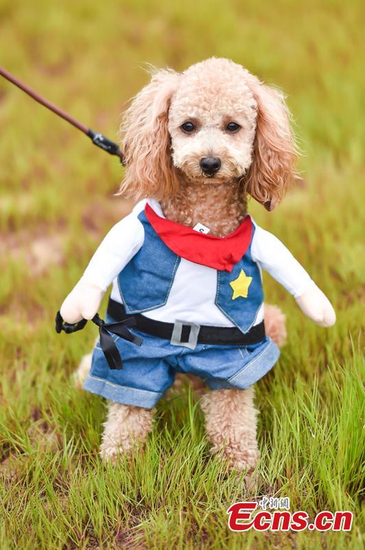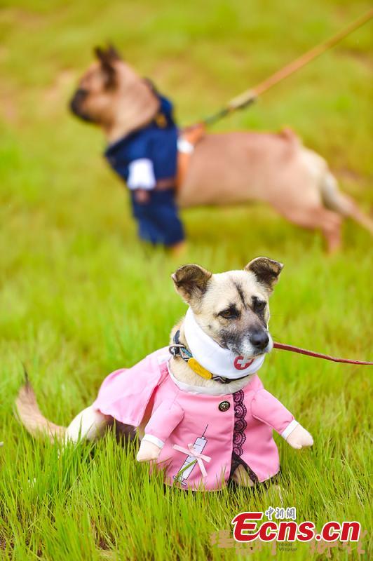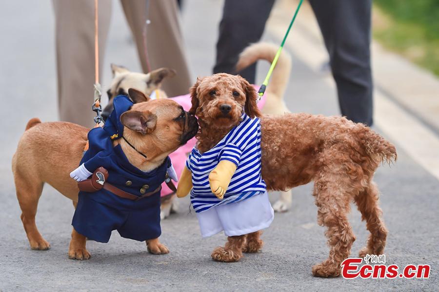Dogs wear cute clothes at an event held at a real estate project in Jiangning District, Nanjing City, the capital of East China's Jiangsu Province, April 21, 2018. The complex integrates rural scenery and village charms into the design of the housing development. (Photo: China News Service/Li Xiaoqi)