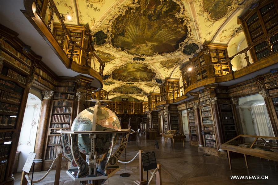 Picture taken on April 20, 2018 shows the Abbey Library in north-eastern Switzerland's St. Gallen city. The library is one of the richest and oldest in the world and contains 170,000 works and some 2,100 original medieval handwritten manuscripts, including the earliest-known architectural plan drawn on parchment. (Xinhua/Xu Jinquan)