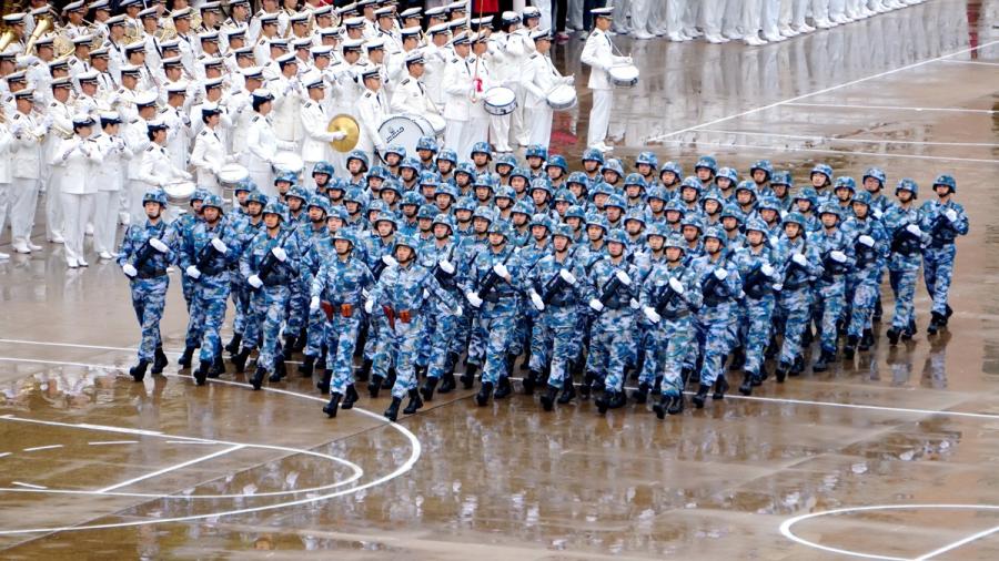 Perfect synchronization! These 1,050 cadets from the Dalian Naval Academy form an invulnerable phalanx as they march forward and seamlessly change formation to the beat of military songs.