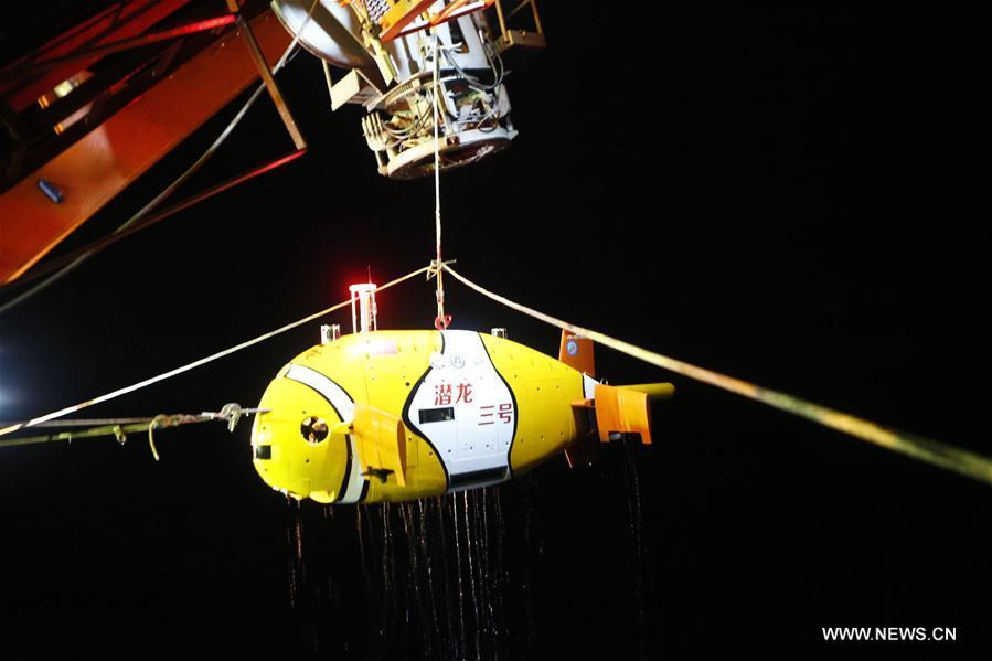 China's unmanned submersible Qianlong III ascends from its second dive back to the Chinese research vessel Dayang Yihao (Ocean No. 1), on April 22, 2018. The submersible, diving for its second sea test, entered the 3,850-meter-deep sea area and traveled 156.82 km during the nearly 43-hour voyage from April 21 to 22. (Xinhua/Liu Shiping)