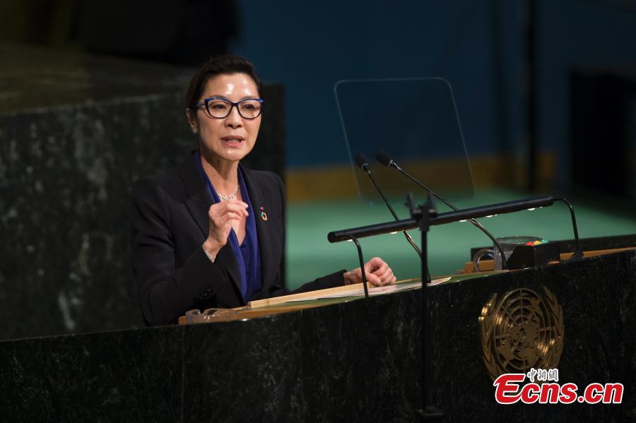 Award-winning actress Michelle Yeoh delivers a speech as UNDP Goodwill Ambassador during the High-Level Meeting on Peacebuilding and Sustaining Peace at the UN headquarters in New York, April 24, 2018. (Photo: China News Service/Liao Pan)