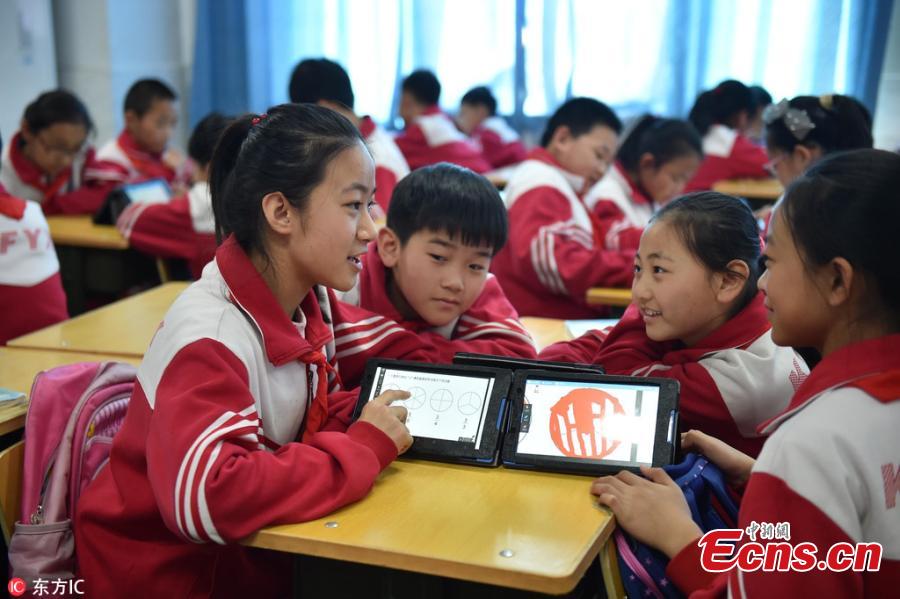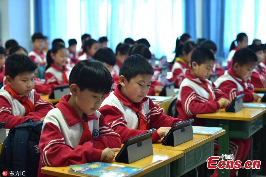 Fifth graders learn with tablets at an elementary school in Langfang City, North China's Hebei Province, April 24, 2018. The school offers a course that makes full use of Big Data, cloud computing, Internet of Things and mobile Internet to help students become IT-savvy. (Photo/IC)