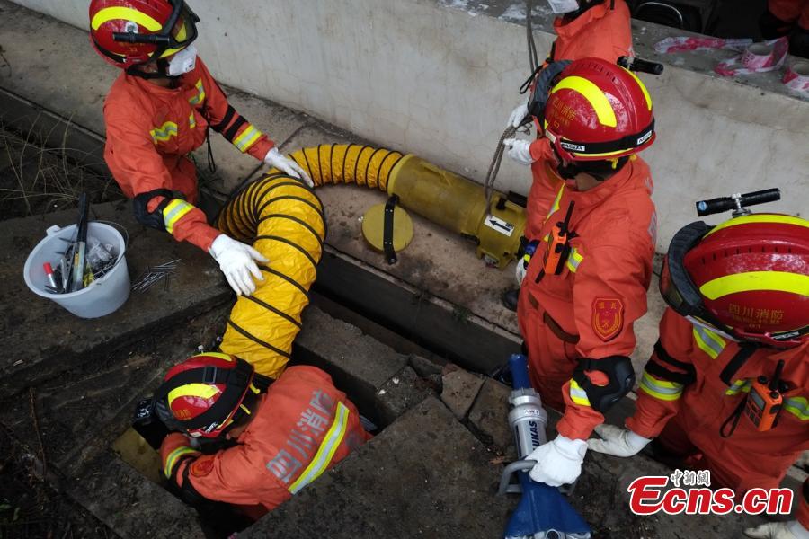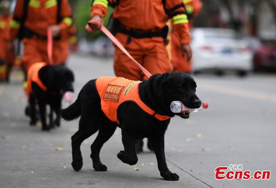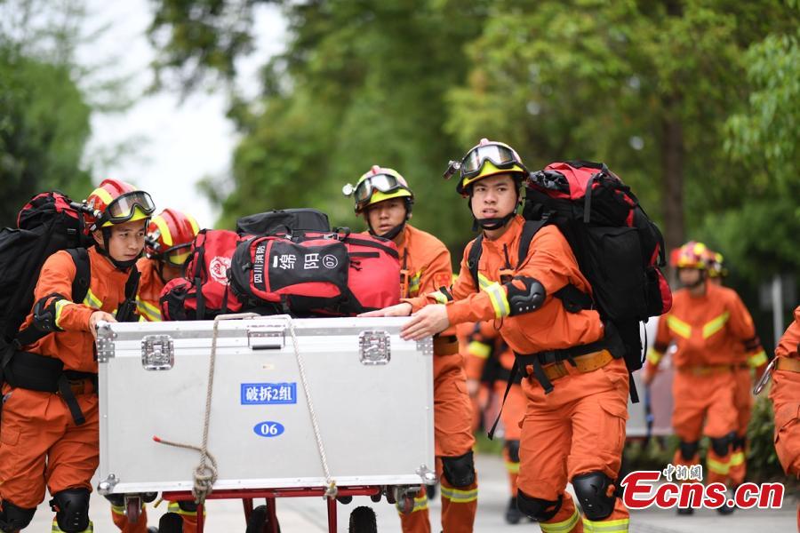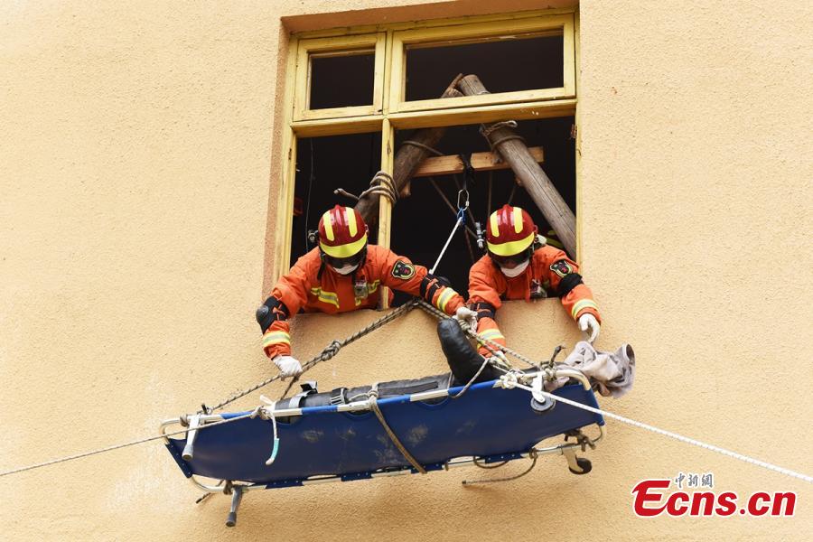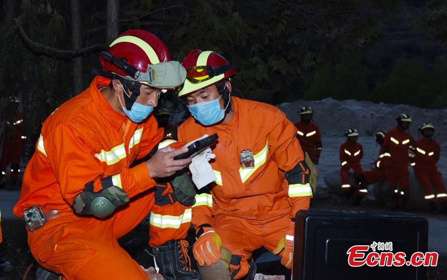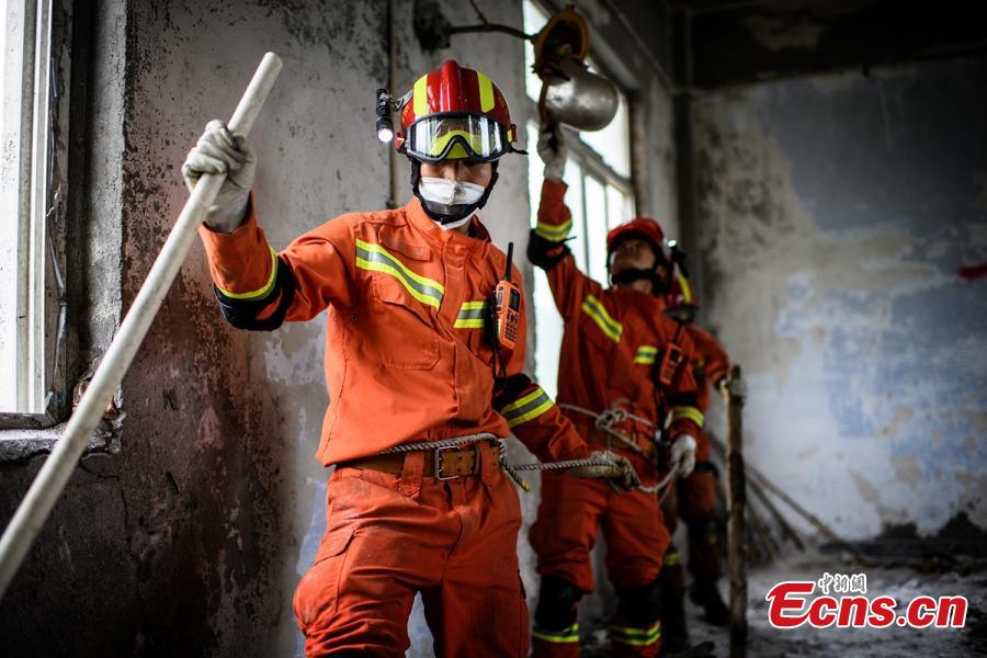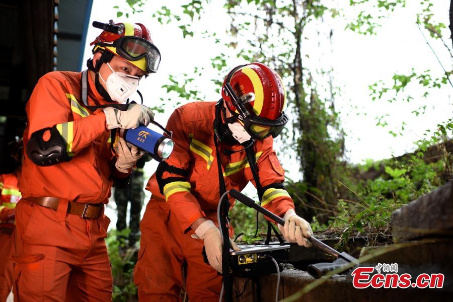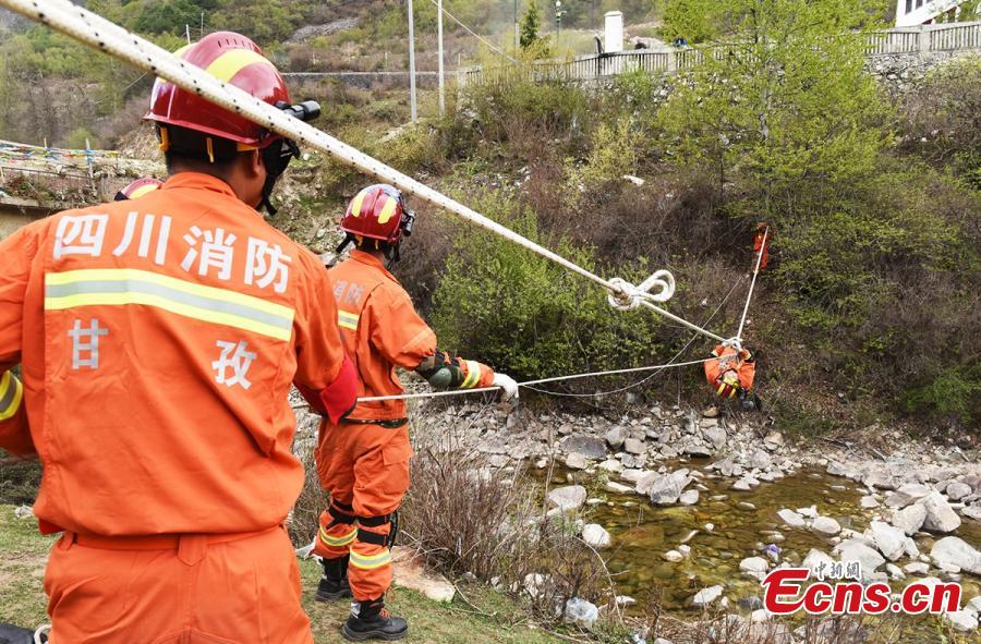 An earthquake response drill is held in Mianyang City, Southwest China's Sichuan Province, April 24, 2018. About 150 firefighters from several cities joined the 2-day drill that simulated a magnitude-6.8 earthquake that trapped many people. The firefighters needed to complete various missions, from setting up temporary shelter to search and rescue operations at collapsed buildings. (Photo provided to China News Service)