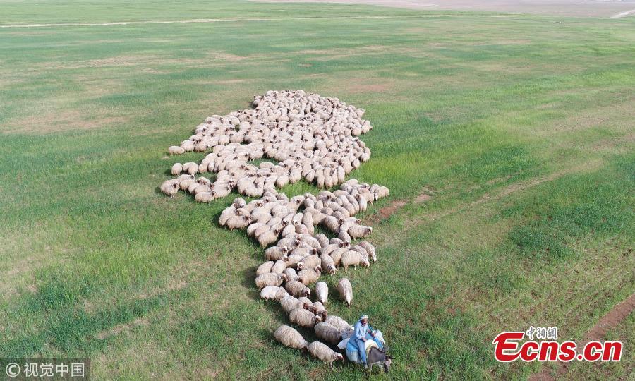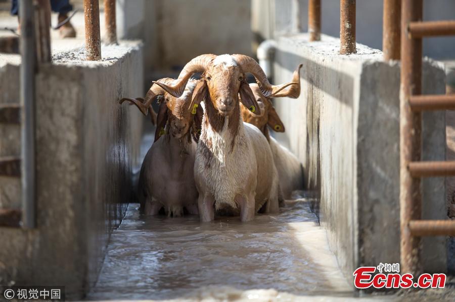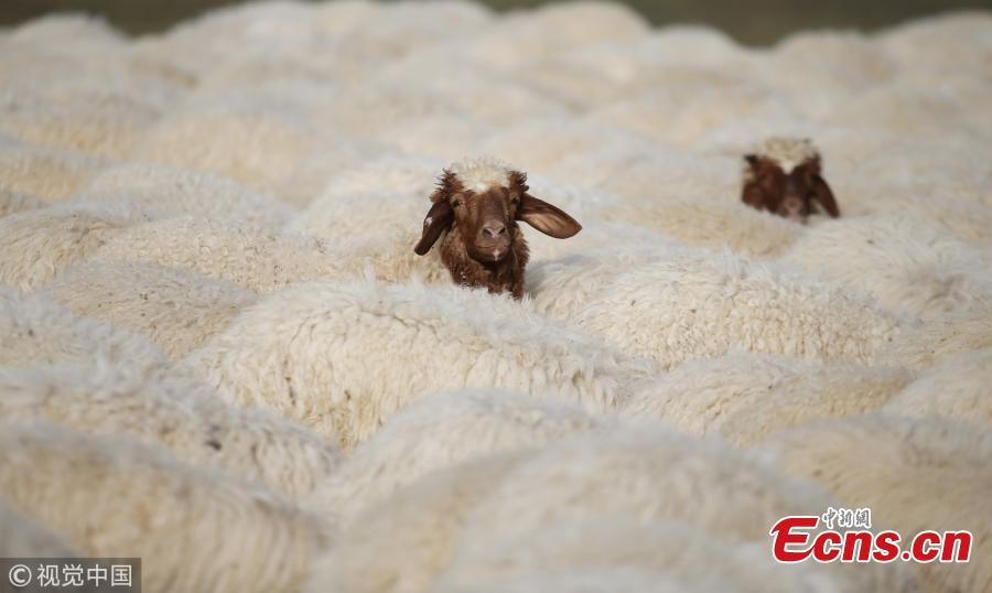 A photo shows the herd of sheep gathering at a pasture after shearing process and being washed to keep them cool and for their growing, at Turkish Ministry of Food, Agriculture and Livestock, General Directorate of Agricultural Enterprises (TIGEM), Ceylanpinar Agricultural Enterprise following the weather heats up, in Sanliurfa province of southeast Turkey, April 25, 2018. (Photo/Agencies)
