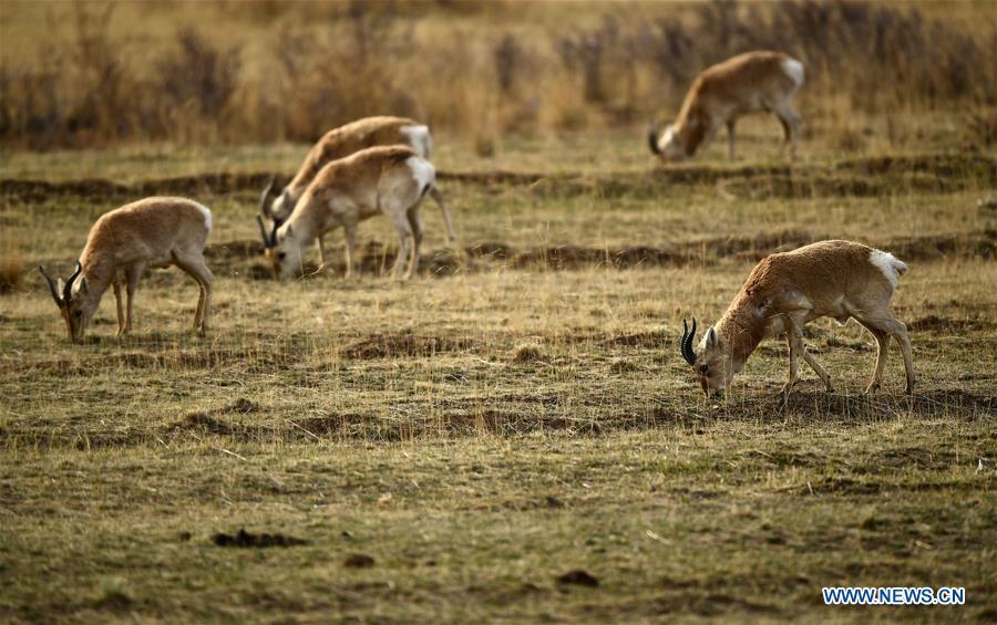 Procapra Przewalskiis are seen in Haibei Tibetan Autonomous Prefecture, northwest China's Qinghai Province, April 26, 2018. The number of Procapra Przewalskii, an antelope species being listed as endangered, has increased to a record high of 2,057 in the latest survey. Przewalski's gazelle was named after Nikolai Mikhaylovich Przhevalsky, a Russian explorer who found a specimen and brought it back to St. Petersburg in 1875. A typical Procapra Przewalskii is 110 to 120 centimeters long and weighing about 15 kilograms. The long-horn animal with a short tail was described as a "ballet dancer" on plateau by Przhevalsky because it jumps in a beautiful curve. (Xinhua/Zhang Hongxiang)