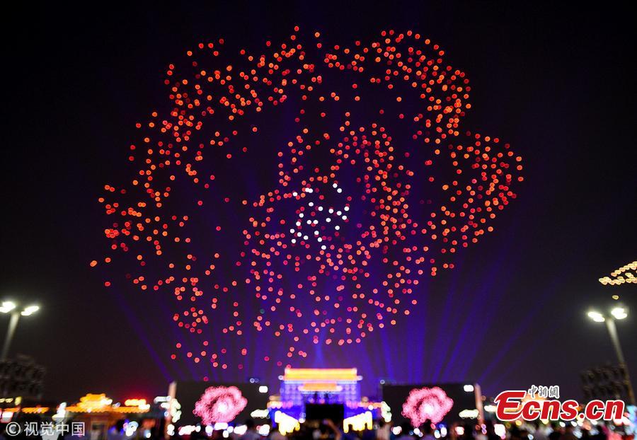Drones make a formation in the air over the illuminated Yongning Gate in Xi'an City, capital of Northwest China's Shaanxi Province, May 1, 2018. A total of 1,374 drones were used to form various patterns, such as the old city wall and scenes from the Silk Road, in the opening ceremony of a cultural festival named after Xi'an's well-preserved old city wall built during the Ming Dynasty (1368-1644). (Photo/VCG)