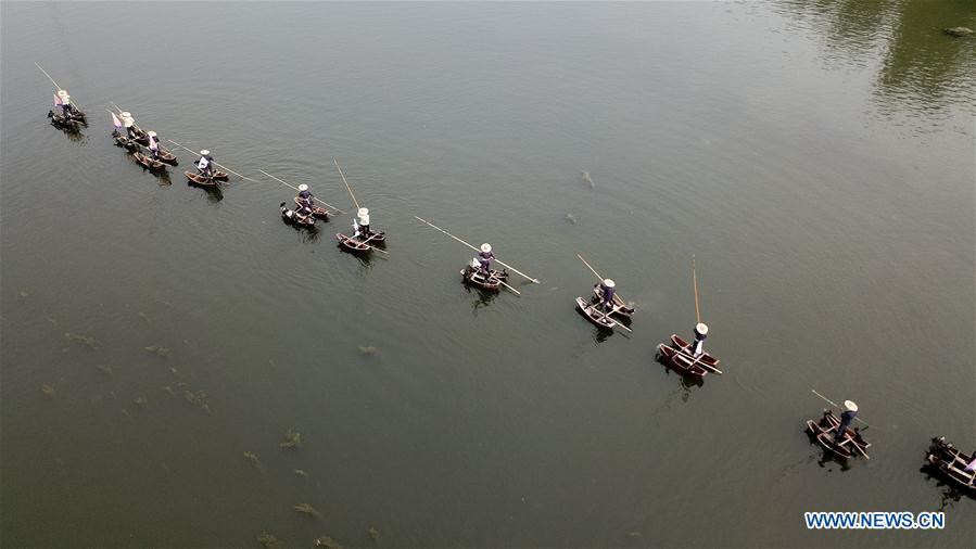 Aerial photo shows cormorants catch fish for villagers on Suihe River in Lingbi County, east China's Anhui Province, April 29, 2018. The performance, depicting the traditional fishing method by cormorants, attracts many tourists during Labor Day holiday. (Xinhua/Zhang Duan)