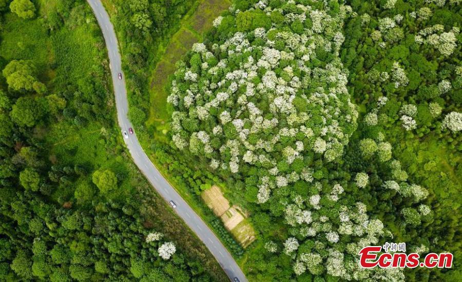 Wild Paulownia trees covering an area of 67 hectares bloom at a scenic spot in Xiannv Lake in Xinyu City, East China's Jiangxi Province, May 1, 2018. (Photo: China News Service/Zhao Chunliang)