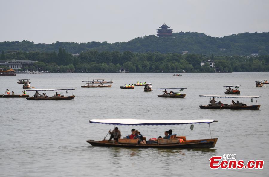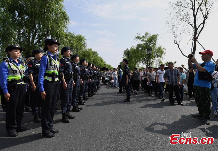 Members of a patrol under the West Lake scenic area administrative department walk along the famed lake in Hangzhou City, East China's Zhejiang Province, May 1, 2018. Started two years ago, the patrol has provided service for 18,500 tourists and also stopped unruly behavior 14,100 times at the tourist attraction. (Photo: China News Service/Wang Gang)