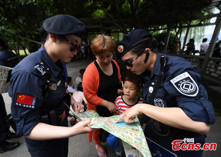 Members of a patrol under the West Lake scenic area administrative department walk along the famed lake in Hangzhou City, East China's Zhejiang Province, May 1, 2018. Started two years ago, the patrol has provided service for 18,500 tourists and also stopped unruly behavior 14,100 times at the tourist attraction. (Photo: China News Service/Wang Gang)