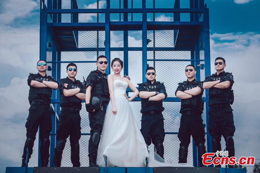 Special police officers join Yang Li and his fiancée Liu Lu for their wedding photos in Mianyang City, Northeast China's Sichuan Province. Due to the intensive training, Yang had little time to take the wedding photos despite the approaching of their big day. Liu decided on her own to bring the photographer to the training site and finally had photos with Yang who was in uniform. (Photo provided to China News Service)