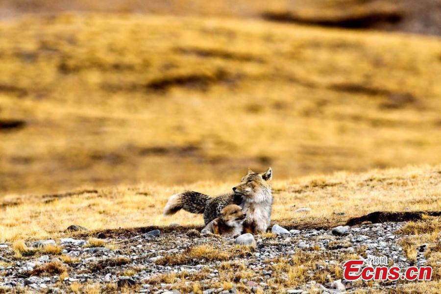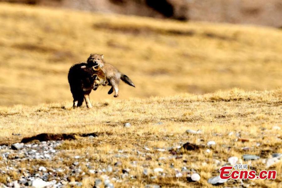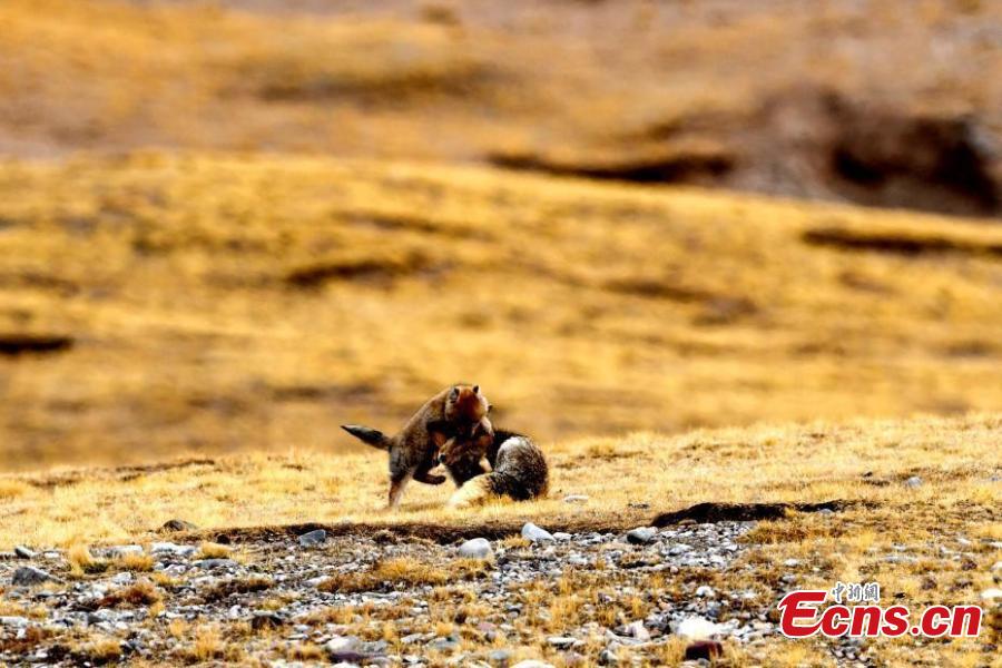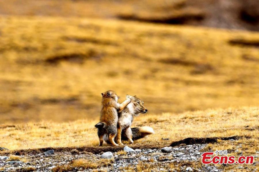 Two Tibetan foxes play in the Yangkang Countryside, Tianjun County, Northwest China's Qinghai Province. The animal is a species of fox endemic to the high Tibetan Plateau. (Photo: China News Service/Zhao Shichun)