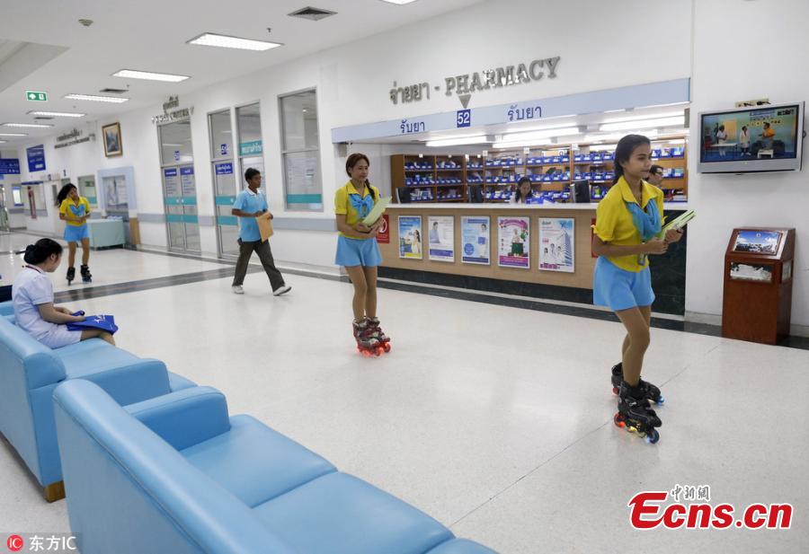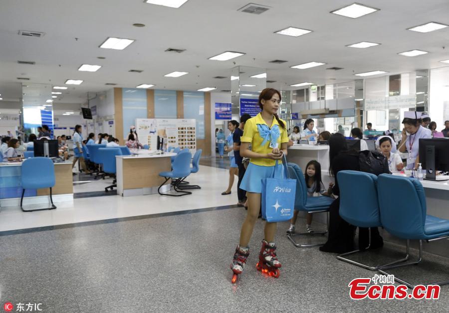 Thai nursing aide, Puntida Jaikla, 20, rollerblades to deliver medical documents at Yanhee International Hospital in Bangkok, Thailand, May 7, 2018. Since 1997 the hospital has a unique approach to ensure a speedy delivery of documents and medical records by having nursing aide staff members gliding through hallways on rollerblades. The hospital was the first in Asia to introduce the rollerblading aides. (Photo/Agencies)