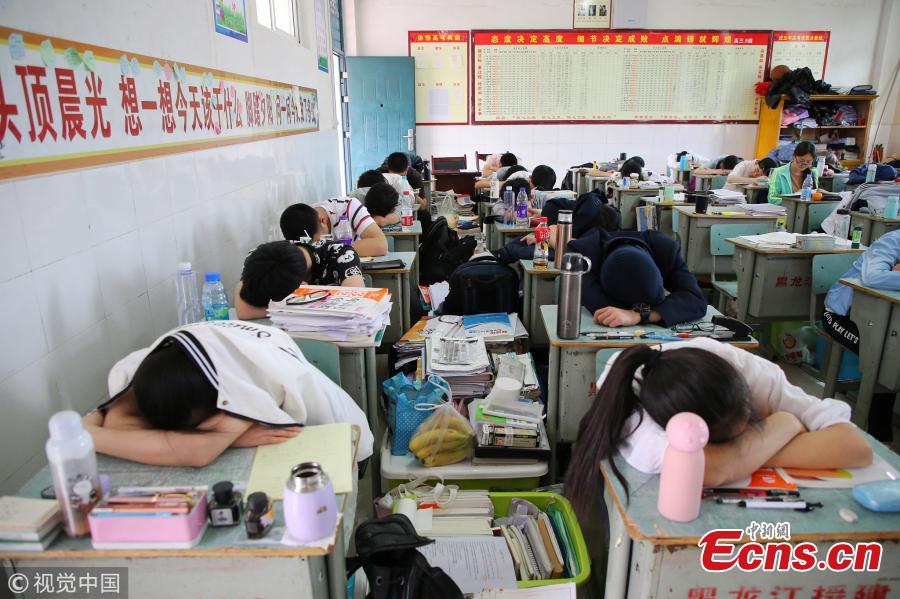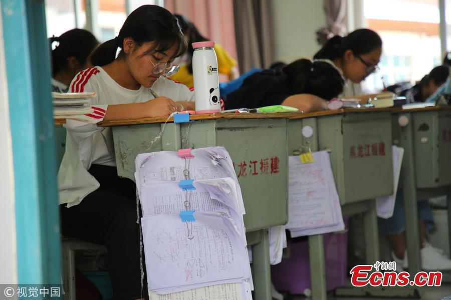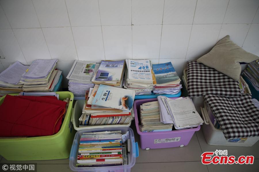 Students have to leave their books and learning materials in a corridor as they study in a crowded classroom at Jianmenguan High School in Jian'ge County, Southwest China's Sichuan Province, May 7, 2018. Senior high school students are making final preparation efforts for the national college entrance exam, known as Gaokao, set to take place in one month's time. (Photo/VCG)