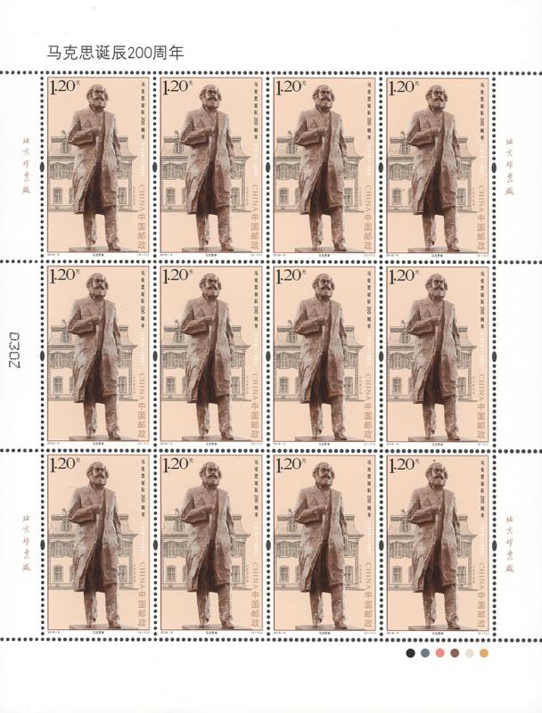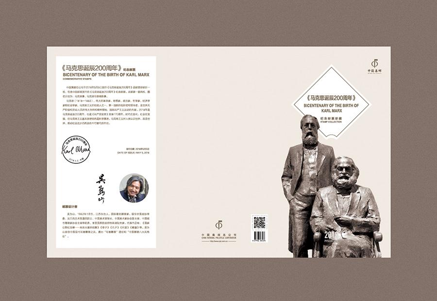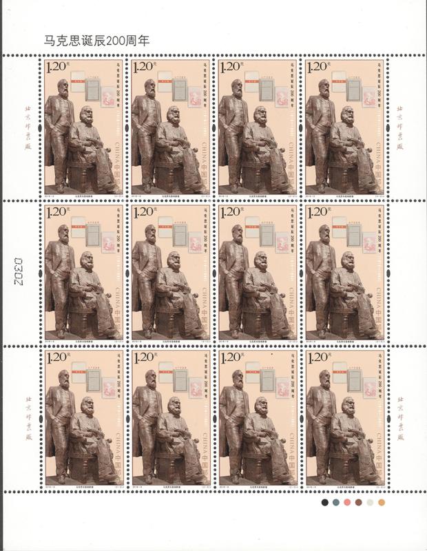 The other stamp of this commemorative set shows two bronze statues of a seated Marx and behind him, a standing Friedrich Engels (1820-95), both created by Wu; and in the background there are covers of Marx's best known titles: the German and Chinese versions of The Communist Manifesto and a Chinese version of Capital.