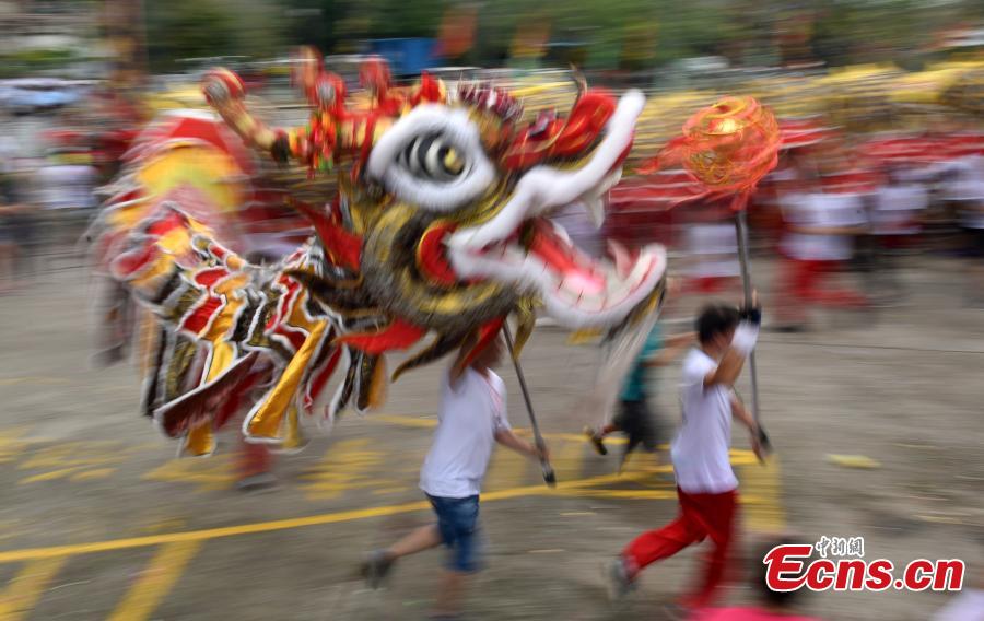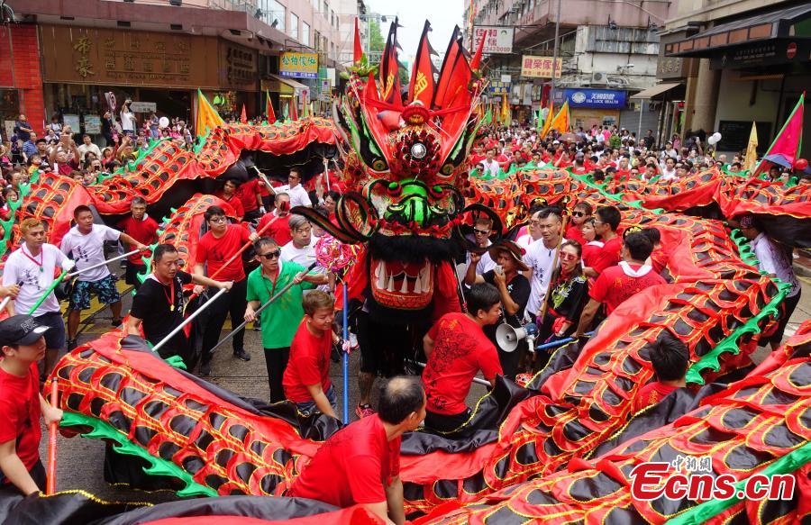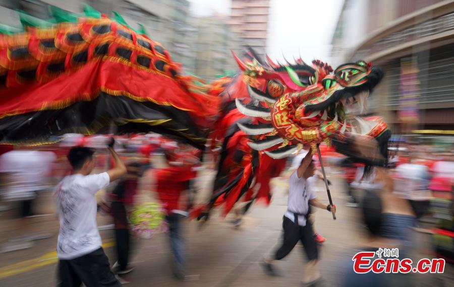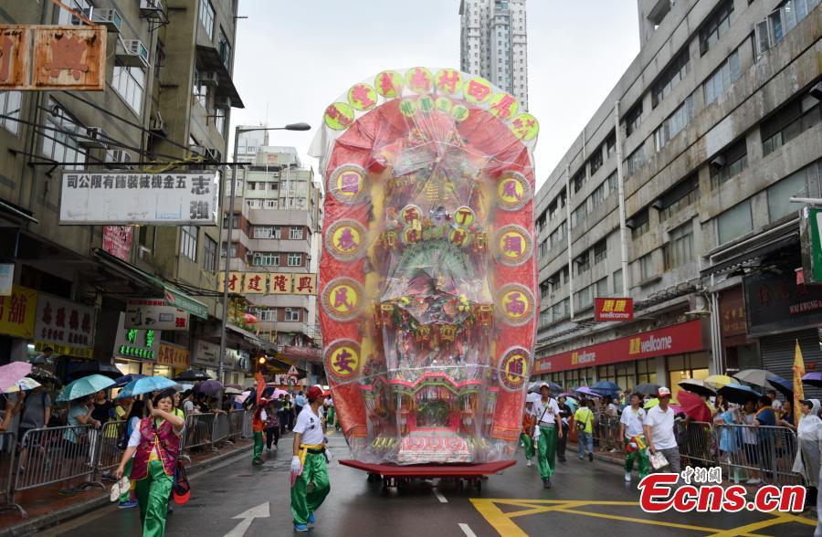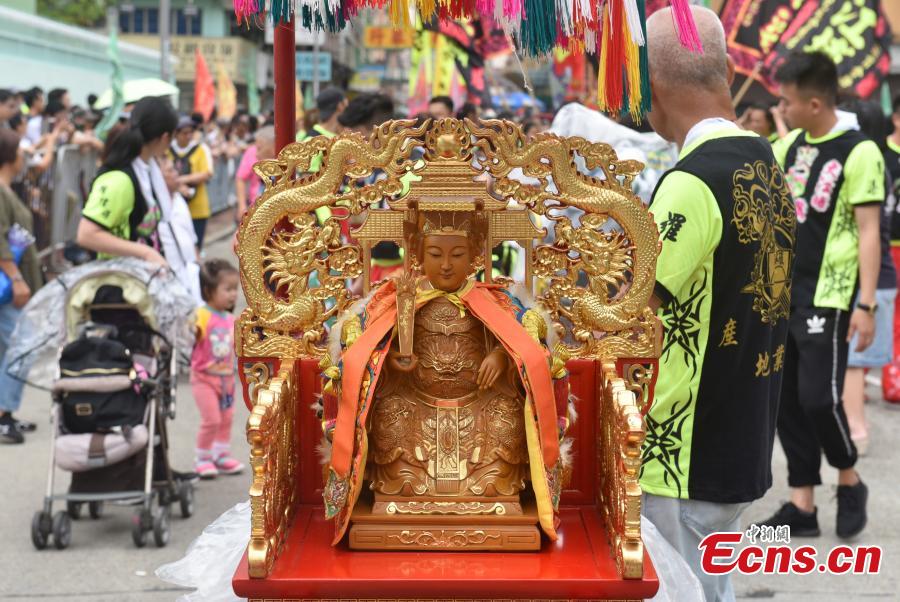 People celebrate the Tin Hau Festival in Hong Kong, May 8, 2018. The festival is one of the most colorful celebrations taking place during the year at temples for Tin Hau, the Goddess of the Sea. Tin Hau's Birthday is celebrated on the 23rd day of the 3rd month in the lunar calendar, May 8 this year. The biggest Tin Hau parade took place in Yuen Long with a whole array of lion and dragon dances, marching bands and cultural performances. (Photo: China News Service/Zhang Wei)