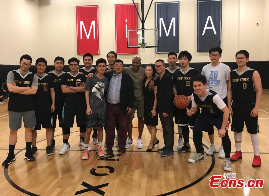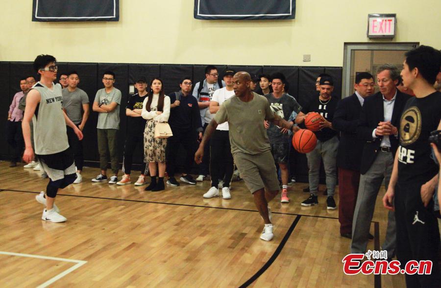 Retiring ex-NBA star Stephon Marbury plays basketball with Chinese students in an exchange match in Manhattan View at MIMA, New York, May 8, 2018. (Photo: China News Service/Ma Delin)