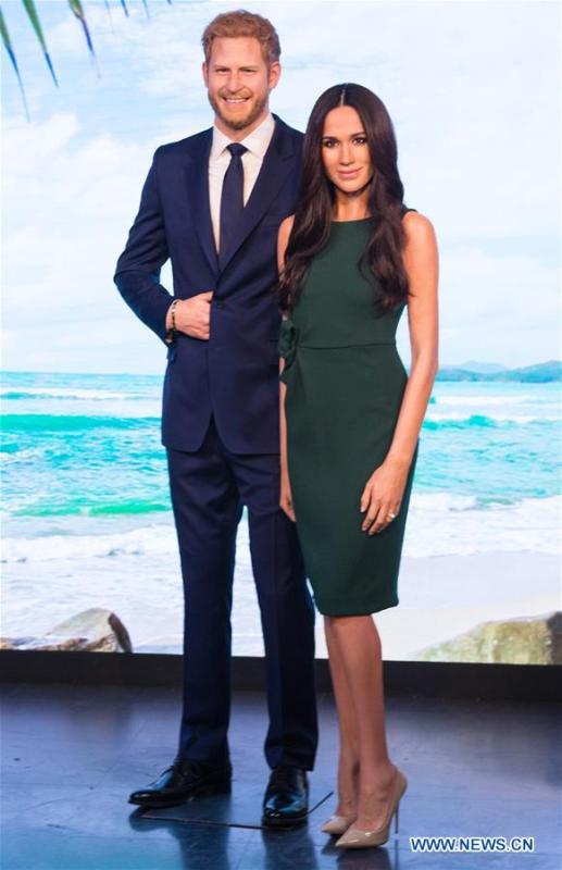 Photo taken on May 9, 2018 shows wax figures of Meghan Markle and Prince Harry at Madame Tussauds in London, Britain. A new wax figure of Meghan Markle was unveiled ahead of her wedding to Prince Harry on May 19 at Madame Tussauds London on Wednesday. (Xinhua/Ray Tang)
