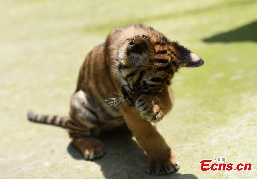 One of the South China Tiger cub triplets meets the public as they turn three months old in Hangzhou City, Zhejiang Province, May 9, 2018. The three tiger cubs are lovely natured and in good health, sources say. (Photo: China News Service/Wang Gang)