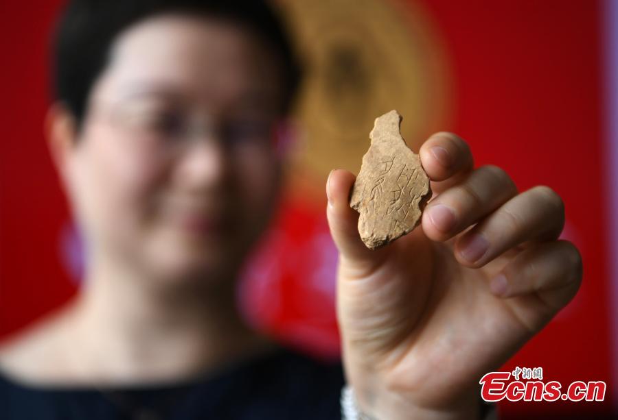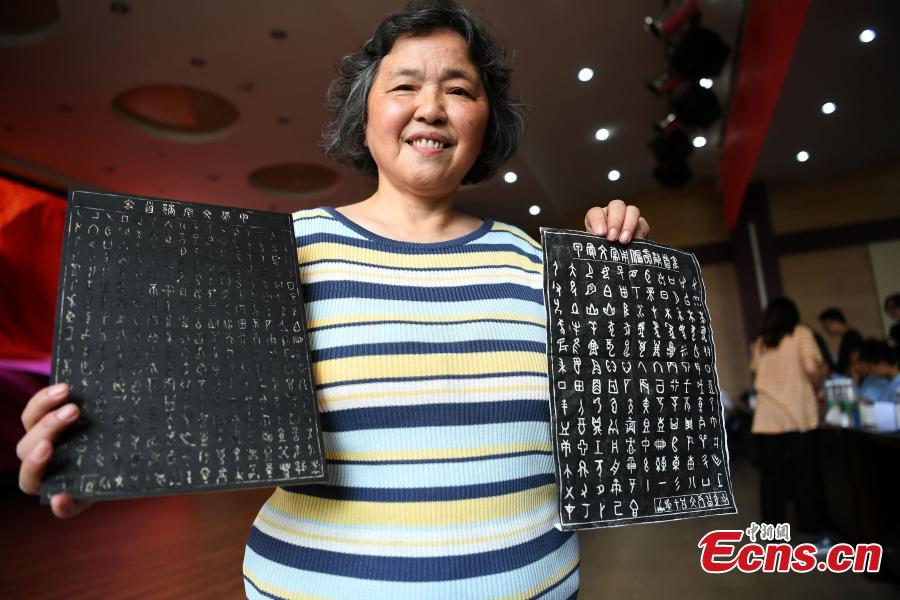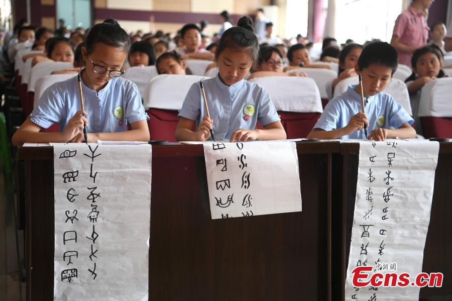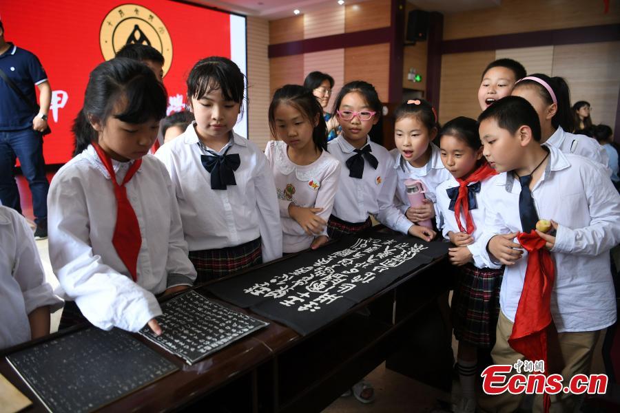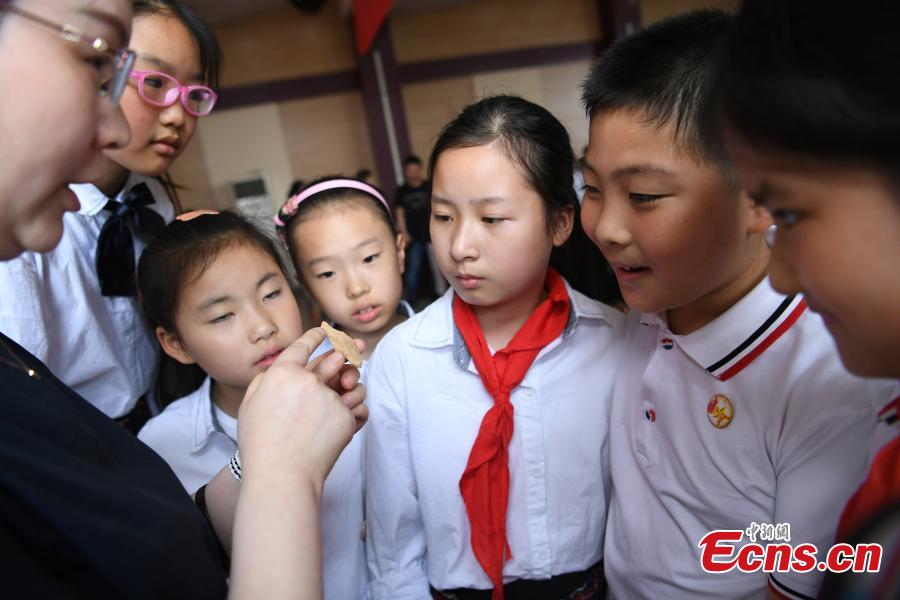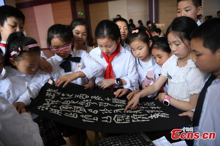 Photo taken on May 8, 2018 shows students at Nankai Elementary School in Southwest China's Chongqing Municipality learned about the Oracle bone script, Chinese characters carved on animal bones or tortoise shells during the Shang dynasty (c. 16th-11th century BC). The library at Shapingba District in Chongqing and an association launched the program to help children understand traditional culture. (Photo: China News Service/Chen Chao)