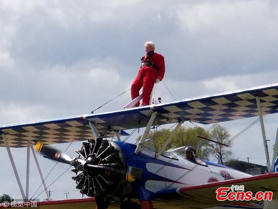 Norma Howard, ready to take to the skies above Cirencester, Gloucestershire, is strapped to the top wing of a vintage biplane at 500ft. Howard, 91, broke the world record as the oldest ever woman to wingwalk on a bi-plane in Rendcomb, Gloucestershire. (Photo/VCG)