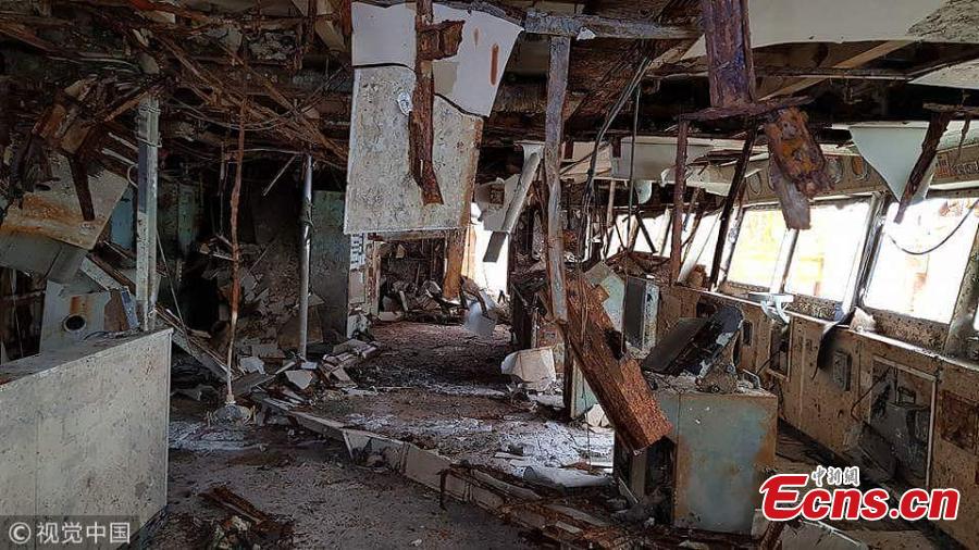 A picture shows what remains inside the Sewol ferry that sank in April 2014 and is now at the southwestern port of Mokpo, South Korea. The 6,825-ton Sewol ferry was moved from its side to an upright position Thursday to facilitate the search for the remains of victims still missing. (Photo/VCG)