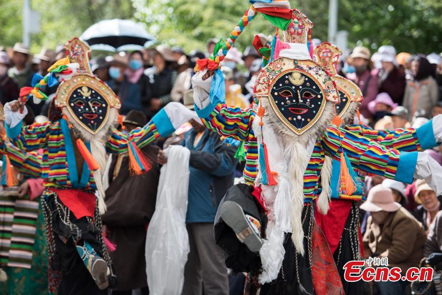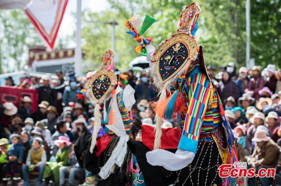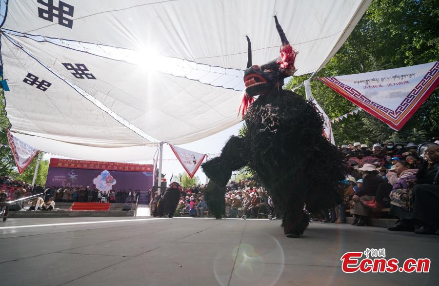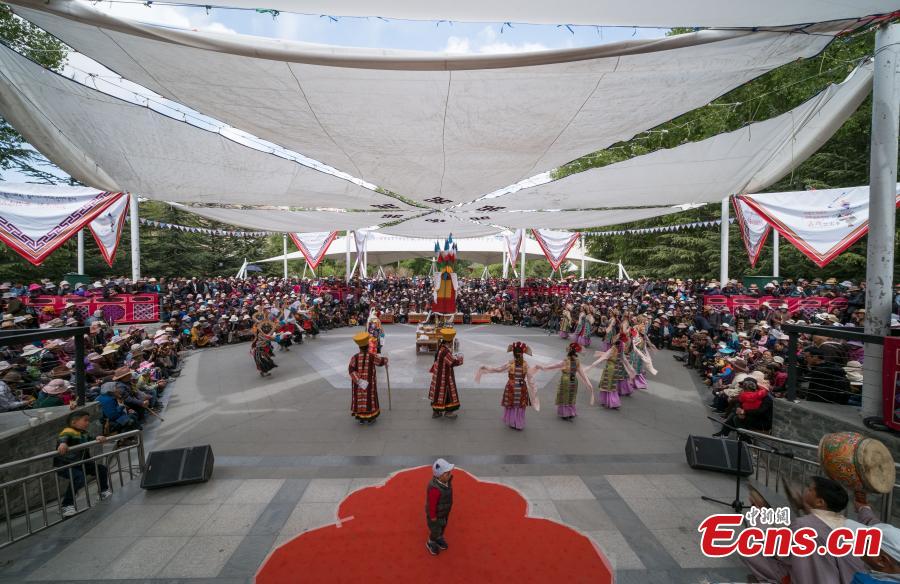 Performers take part in classical Tibetan Opera Sukyi Nyima at Zongjiao Lukang Park near the Potala Palace in Lhasa, Tibet Autonomous Region, May 12, 2018. More than 450 performers will take part in shows on Saturdays during the Tibetan Opera season from May 12 to late August. Tibetan opera, a comprehensive art combining folk song, dance, storytelling, chant and religious performance, was inscribed in 2009 on the UNESCO Representative List of the Intangible Cultural Heritage of Humanity. (Photo: China News Service/He Penglei)
